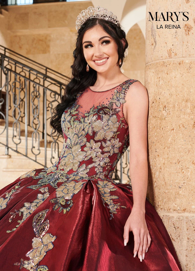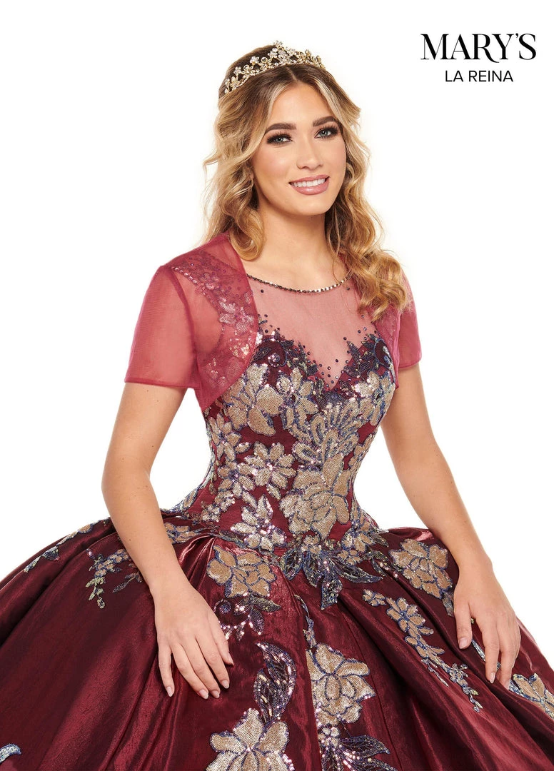 Make a grand entrance in this floral sequin print long sleeveless satin dress with A-line skirt by Mary’s Bridal Quinceanera MQ2117. Luster satin ball gown with a sheer yoke basque waistline and full pleated skirt with side seam pockets. The gown features cascading iridescent sequin applique and glittering stone beading. The gown finishes with a corset back and a sweep train. The matching bolero jacket is included.
