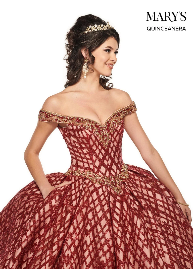 All eyes will be on you in this glitter pattern long off the shoulder dress with A-line skirt by Mary’s Bridal Quinceanera MQ2088. Glamorous glitter overlay ball gown with a sophisticated off the shoulder neckline encrusted with stones, crystals, and beads. The fully pleated skirt has been glittered to match and finishes with a sweep train. The gown features a lace up back closure and matching cape.