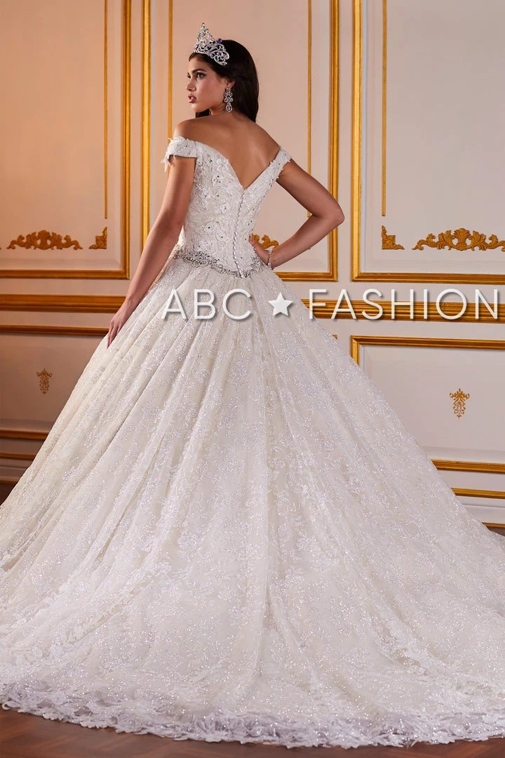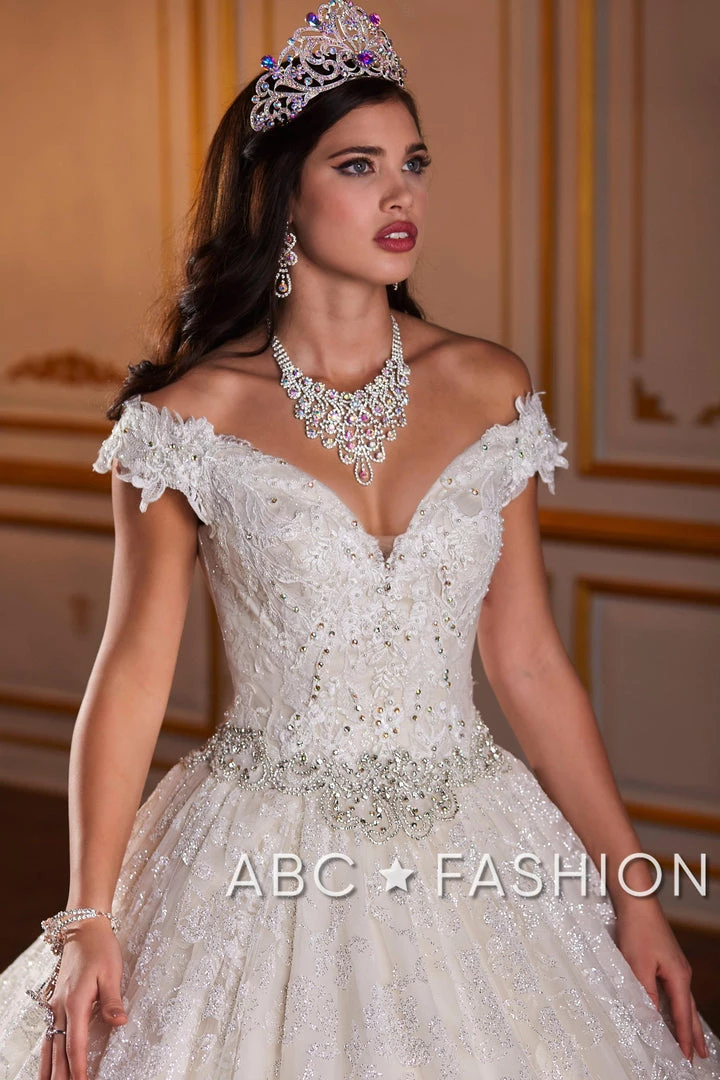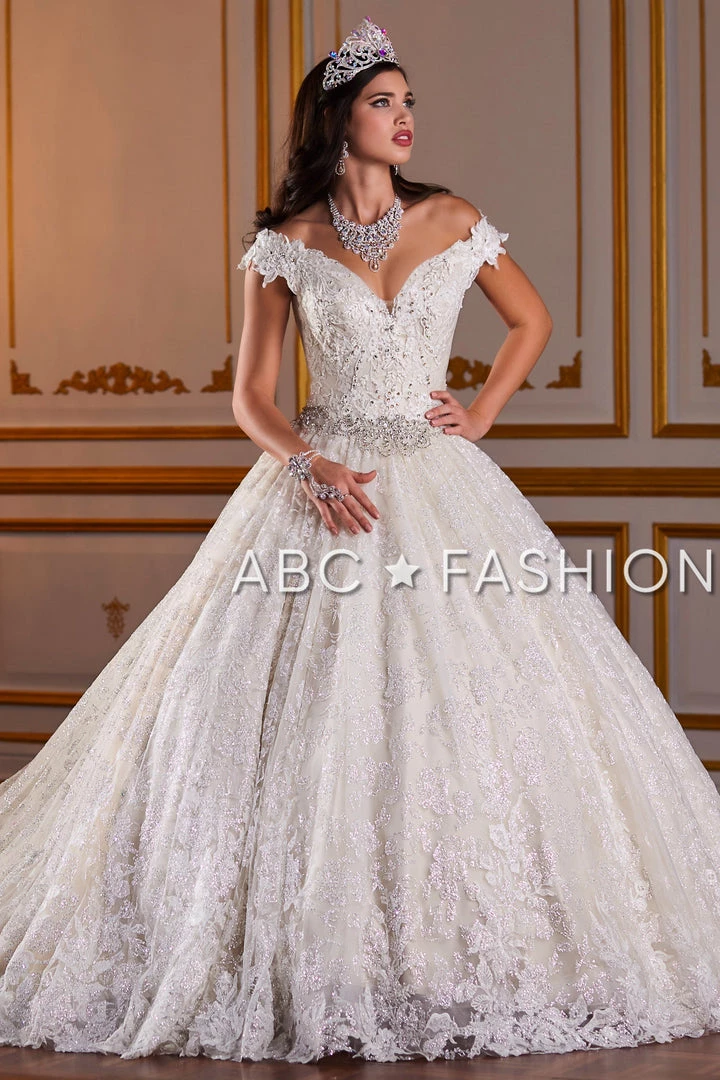 Look like a fairy-tale Princess in this long metallic lace off-the-shoulder dress with A-line skirt by House of Wu Quinceanera Collection 26926. Fit for a modern princess, this metallic lace off the shoulder ball gown will have everyone staring. The V-neck bodice is accented with crystal beading for extra sparkle. This look is finished with a gorgeous crystal beaded waist band.