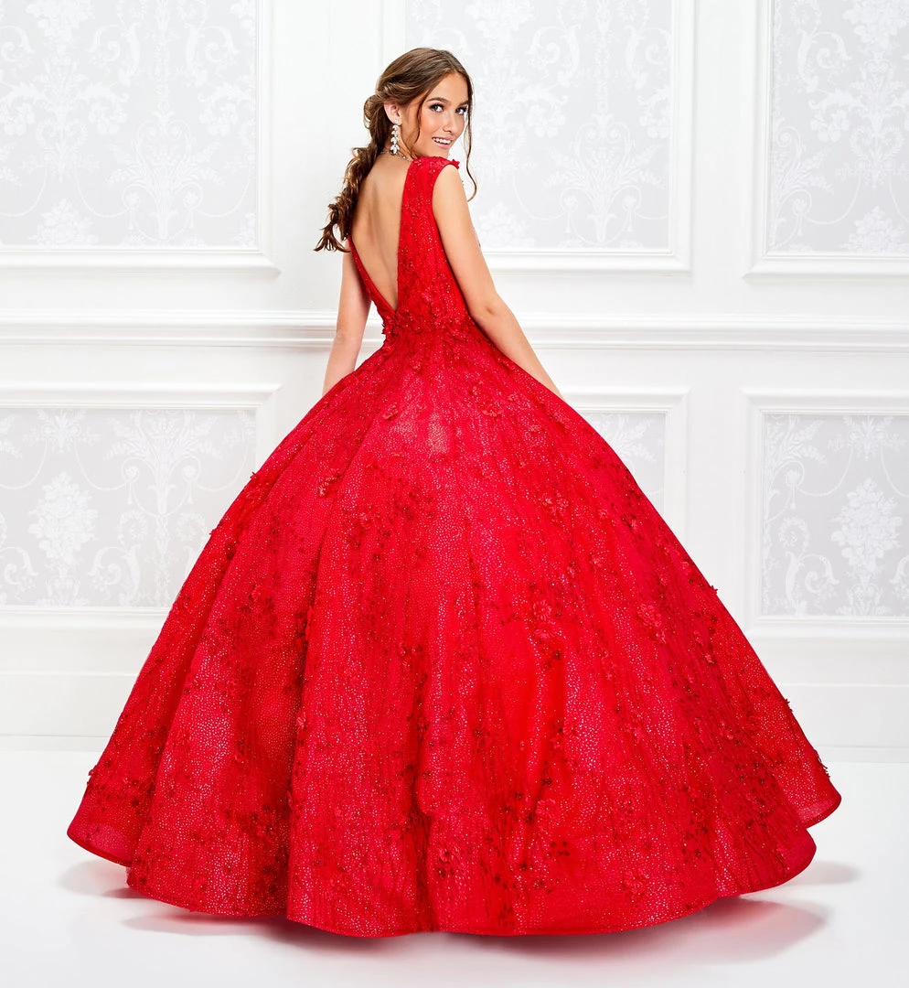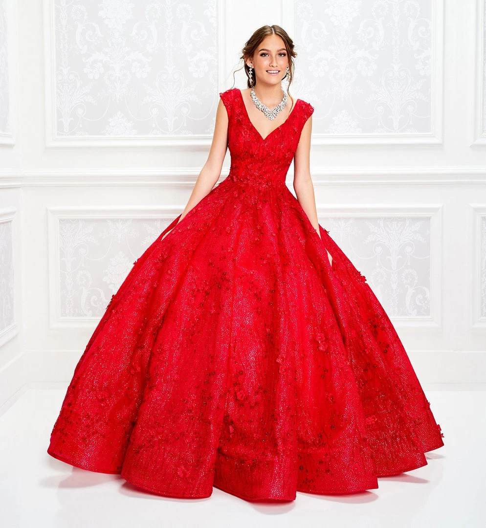 Light up the room in this long V-neck dress with A-line skirt by Princesa by Ariana Vara PR11930. Made out of sparkle tulle and lace, this beautiful cap sleeve ball gown is adorned with three-dimensional flowers, V-neckline, natural waist with flower accents, deep plunging V-back, a voluminous gathered skirt with a horsehair hem, and a zipper back. Matching cape is included.