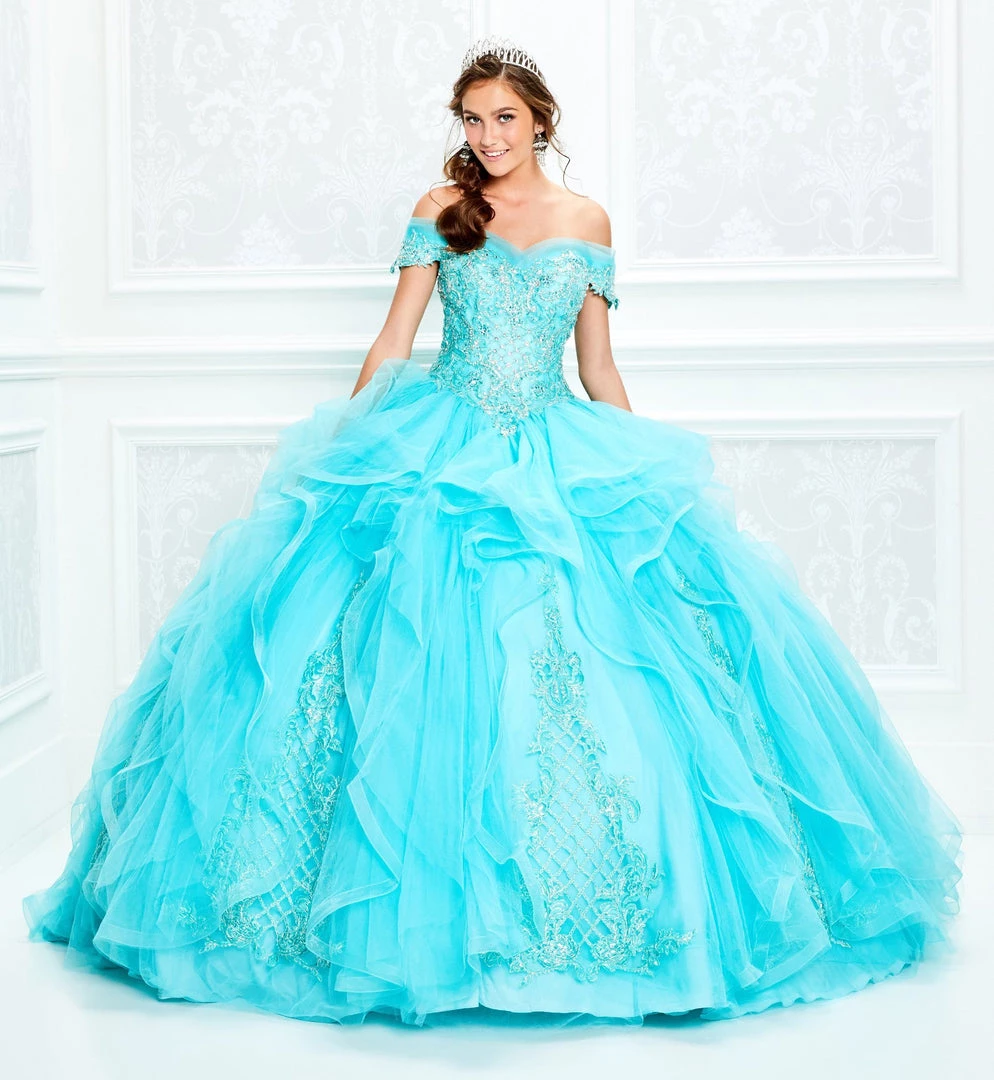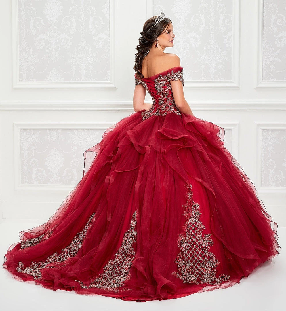Be selfie ready in this embroidered long off the shoulder dress with A-line ruffled skirt by Princesa by Ariana Vara PR11934. Made out of tulle, this beautiful off shoulder ball gown is adorned with embroidered lace, sweetheart bodice trimmed with horsehair accented with embroidered lace, basque waist, lace up corset back, multi-ruffled skirt with horsehair trim, lace accents, and a chapel train. Matching shawl is included.