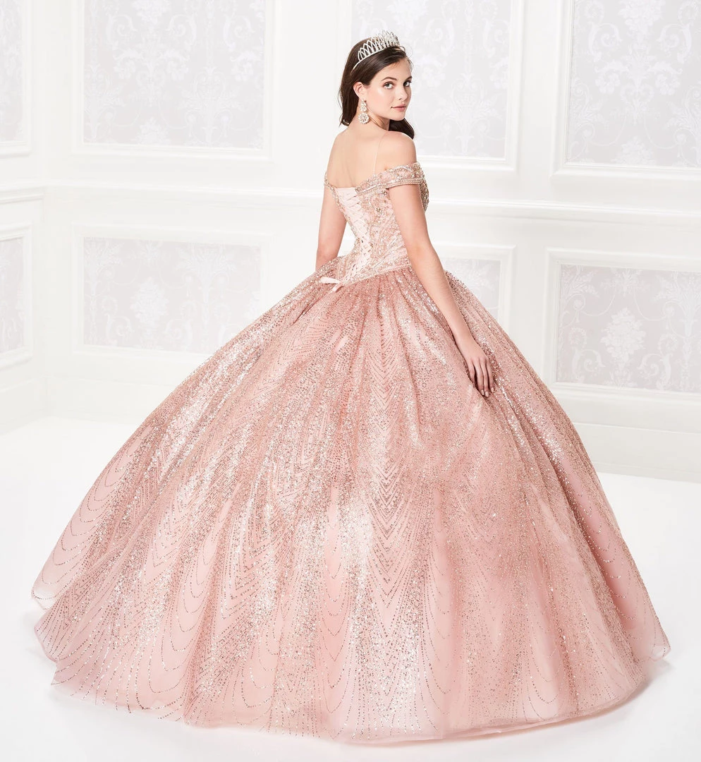 Sparkle from every angle in this long cold shoulder glitter dress with A-line skirt by Princesa by Ariana Vara PR21958. Made out of tulle, this beautiful off the shoulder ball gown features spaghetti straps for added support, jewel encrusted sweetheart bodice, basque waist with a beaded waist detail, lace-up corset back, and a full skirt with a small train. Matching tulle cape is included.