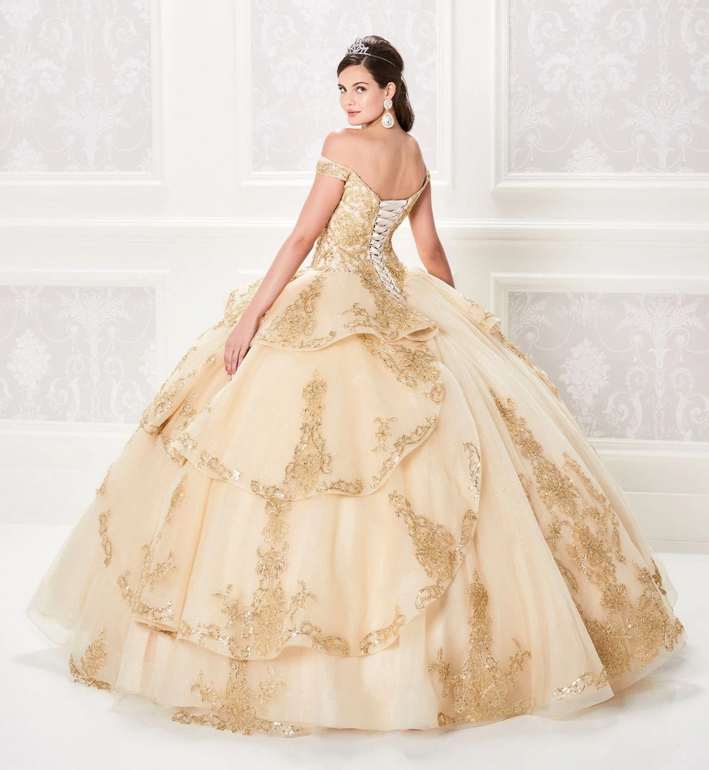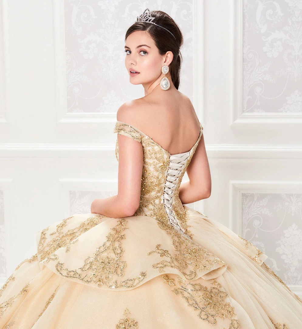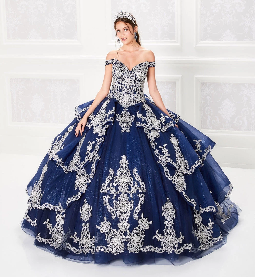 Be selfie ready in this lace applique long off shoulder dress with A-line tiered skirt by Princesa by Ariana Vara PR21966. Made out of sparkle tulle, this beautiful off the shoulder ball gown features a sweetheart neckline, appliqued bodice, basque waist, corset lace-up back, tiered skirt with a horsehair trim detail on each tier and on the hemline, scattered appliques throughout the skirt, small train, and stone accents throughout the gown. Matching tulle cape is included.