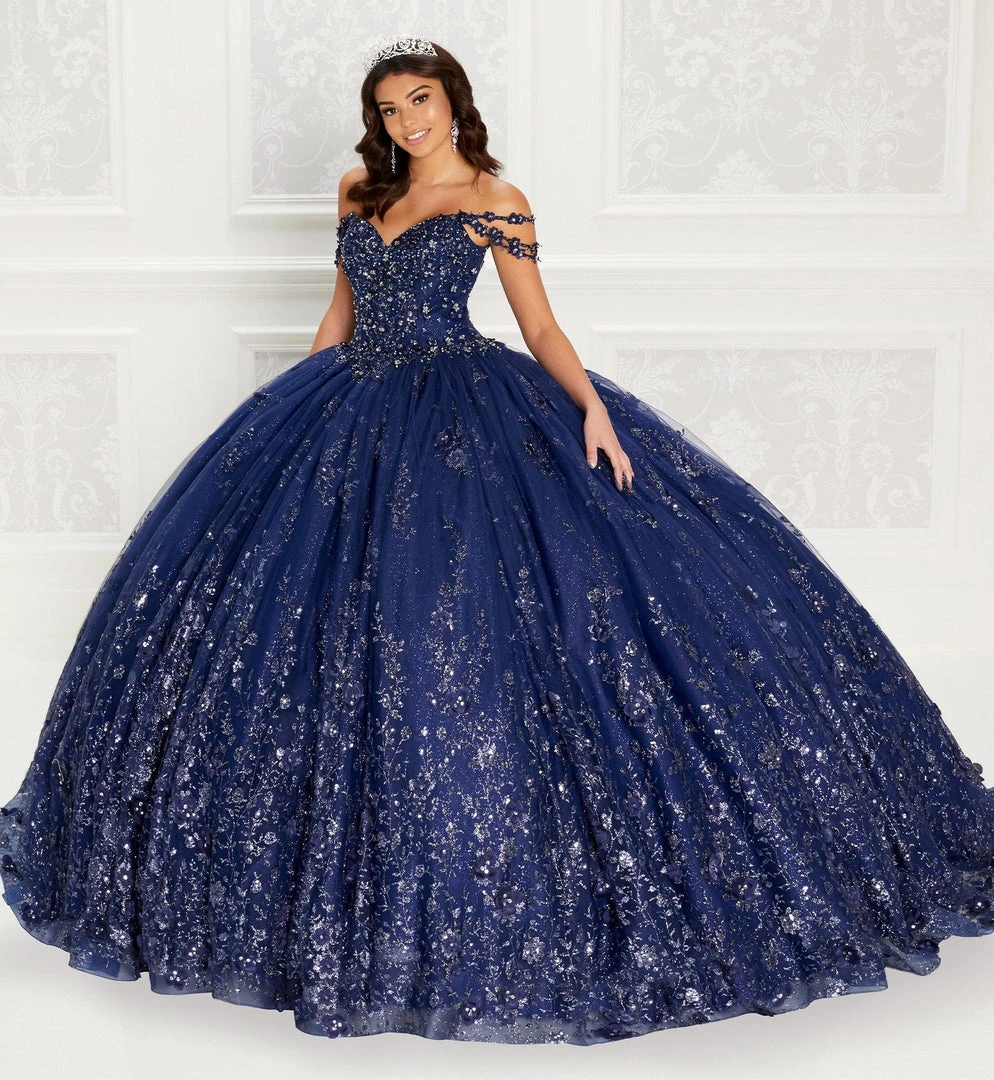 Light up the room in this 3D floral long off the shoulder glitter dress with A-line skirt by Princesa by Ariana Vara PR22145. Made out of glitter tulle, this beautiful off the shoulder ball gown features a sweetheart neckline, beaded bodice, basque waist, corset back, three-dimensional flowers throughout, stone and crystal accents and off-the-shoulder floral strap details. Short cape is included.
