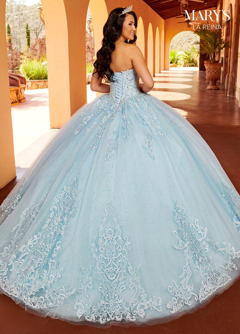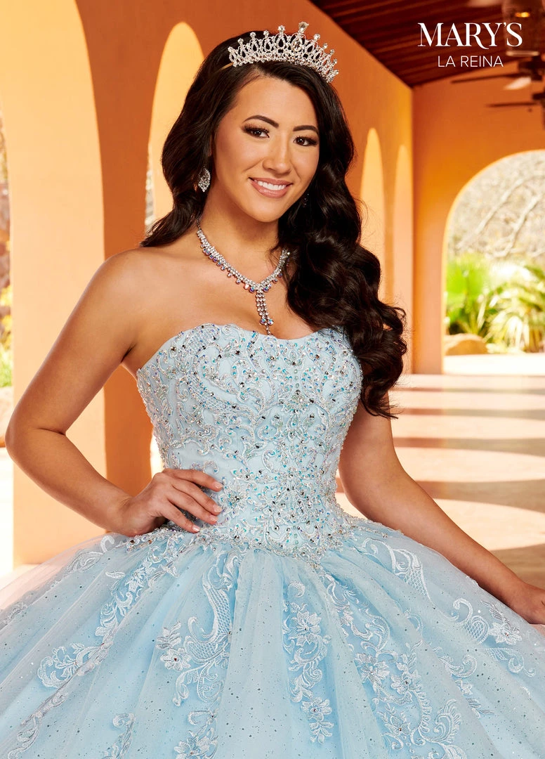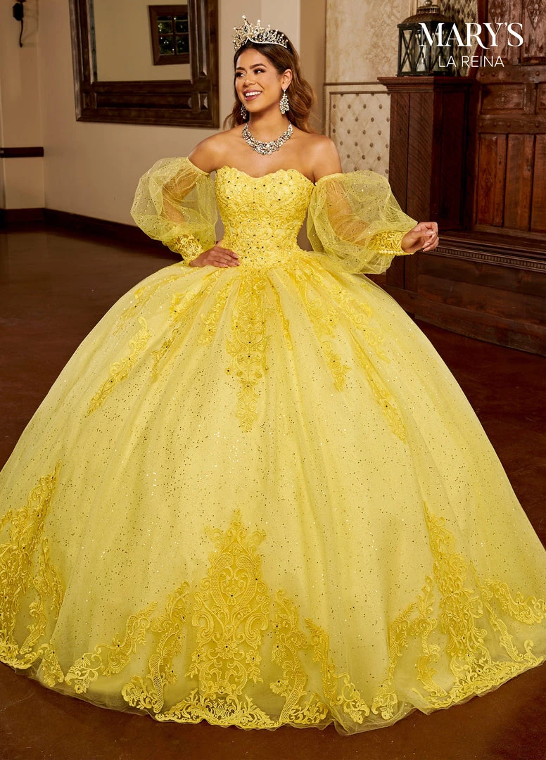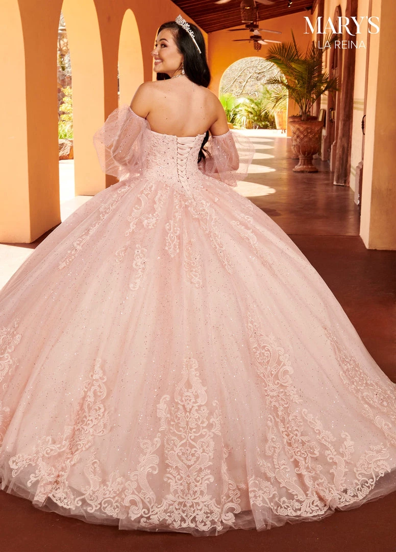 Look picture-perfect in this applique long puff sleeve dress with A-line skirt by Mary’s Bridal Quinceanera MQ2150. This strapless glitter tulle quinceanera ball gown features a sweetheart neck line, bodice with beaded applique, detachable sheer puff sleeves, applique detail on skirt, and sweep train. Detachable royal train and a tulle cape is included. Matching Mini Quince is available as style MQ4035.