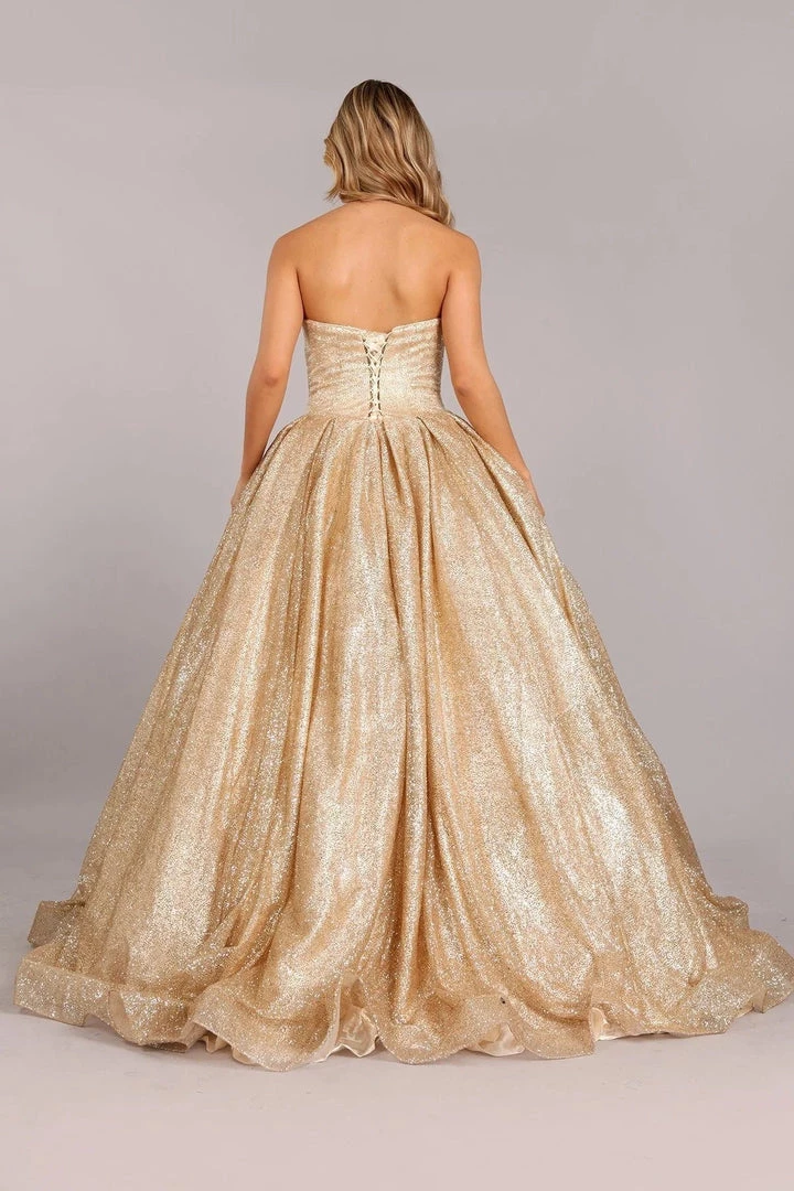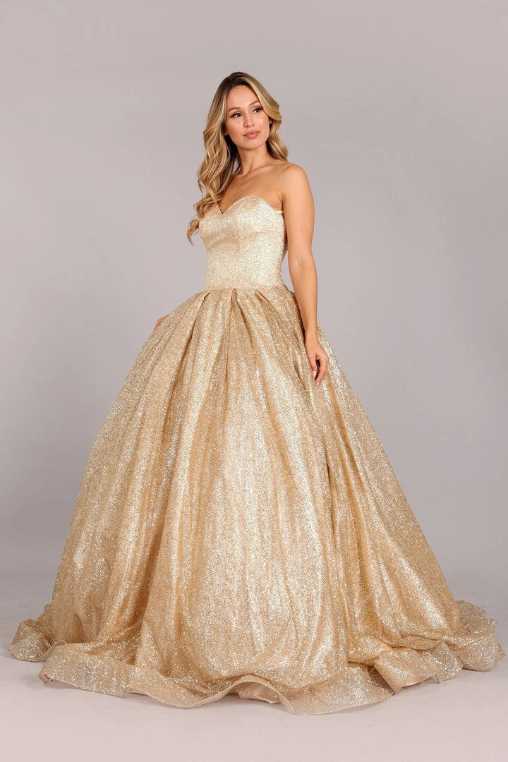 You’ll love twirling around in this rose gold long strapless glitter dress with A-line skirt by Cinderella Couture. Made out of glittering fabric, this beautiful dress features a strapless sweetheart neckline. Cinched with a lace up corset back with a dropped waist, the ballgown skirt flares with box pleats as it touches the floor with a brush of train.