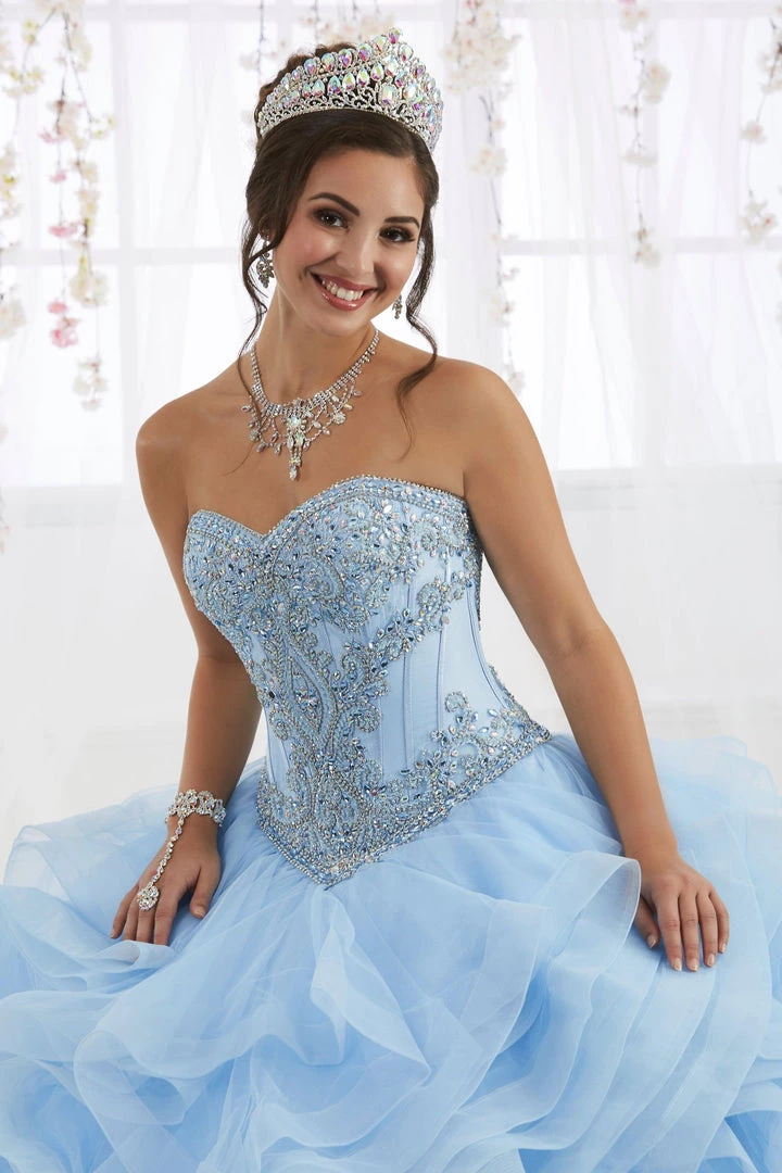 Command attention in this long strapless sweetheart tulle dress with ruffled skirt by House of Wu 26916. Fit for a modern princess, this stunning ball gown features a crystal beaded strapless sweetheart bodice with exposed boning for a touch of drama. Cascades of ruffle tulle with horsehair add excitement to the floor length skirt. This look is finished with a corset back and a beautiful sweep train.