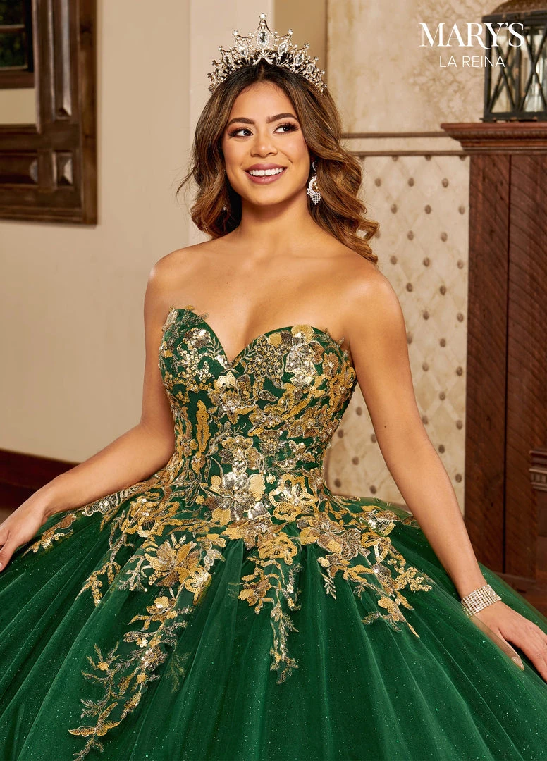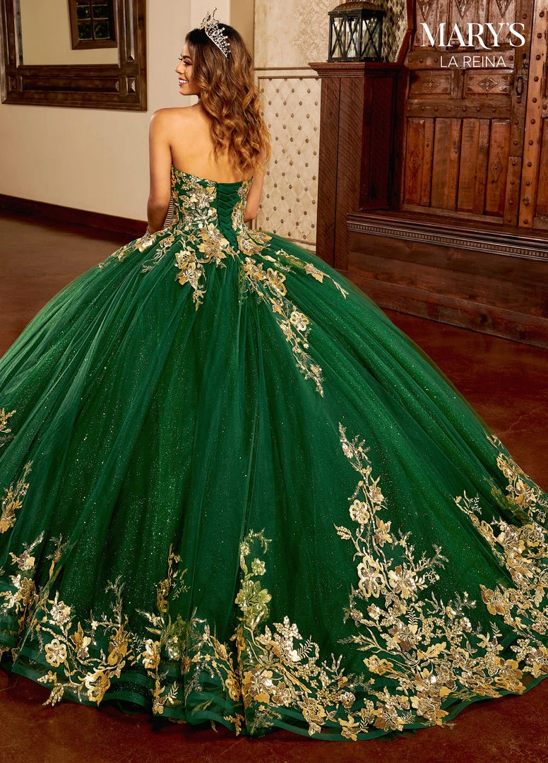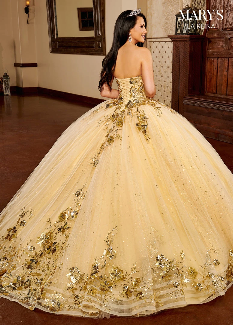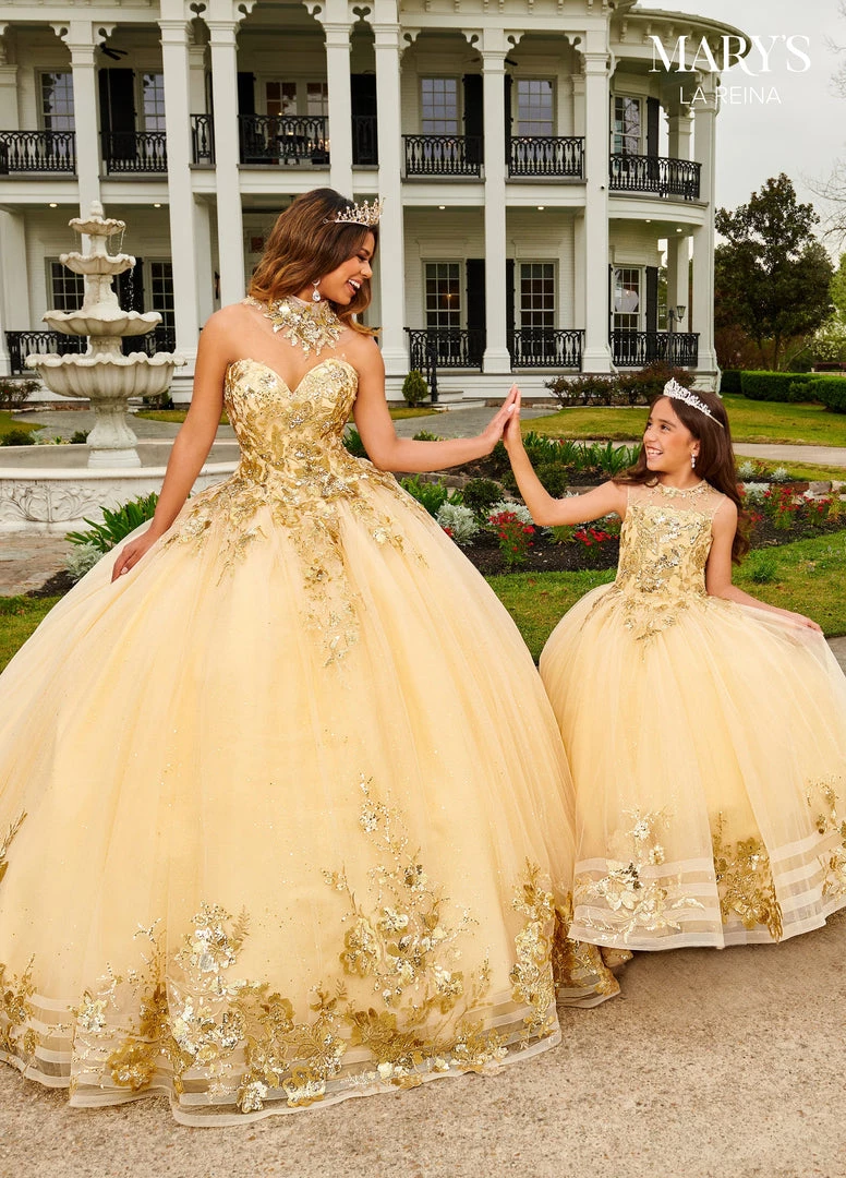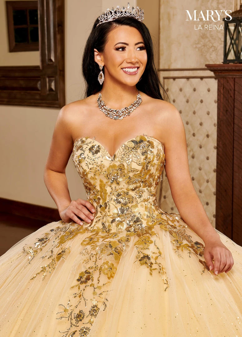 Make lasting memories in this gold applique long strapless tulle dress with A-line skirt by Mary’s Bridal Quinceanera MQ2158. This glitter tulle quinceanera ball gown features a strapless sweetheart neck line, sequin applique, horsehair trims at the bottom of the skirt, lace-up back closure, and sweep train. Matching detachable choker and tulle bolero jacket is included. Matching Mini Quince is available as style MQ4037.