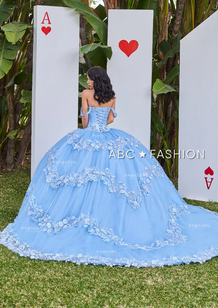 Make a grand entrance in this 3D floral applique sky blue ball gown with A-line skirt by Ragazza Fashion D53-553. This beautiful long off the shoulder dress features a sweetheart bodice adorned with beaded embellishments and 3-dimmensional floral appliquƩs, draped cap sleeves, open back, floor length A-line skirt, sweep train, and a lace-up corset back.
