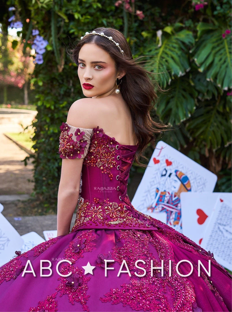 Look picture-perfect in this 3D floral applique two-piece ball gown with A-line skirt by Ragazza Fashion D50-550. This beautiful long off the shoulder dress features a sweetheart bodice adorned with beaded embellishments and 3-dimmensional floral appliqués, sheer short sleeves, open back, floor length A-line skirt, sweep train, and a lace-up corset back.