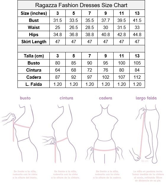 - Ragazza Fashion makes custom size dresses according to your bust, waist, and belly button to floor measurements. Please order the general size you need. After we receive your online order, we’ll call you for the body measurements to give to Ragazza. If you need a size bigger than a 13, please select the “Size Bigger than 13 (+$150.00)” size option.