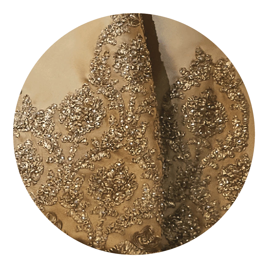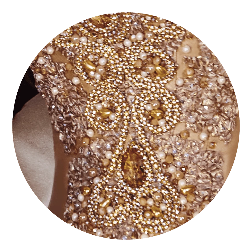 En Espanol: La pieza mÔs emblemÔtica de la colección creada en fastuoso textil micado, un diseño que deslumbra por sus hermosos cristales de SWAROVSKI®, exquisitas aplicaciones en chapa de oro, finos bordados y distintas técnicas que se traducen en mas de 200 horas de minucioso trabajo artesanal.