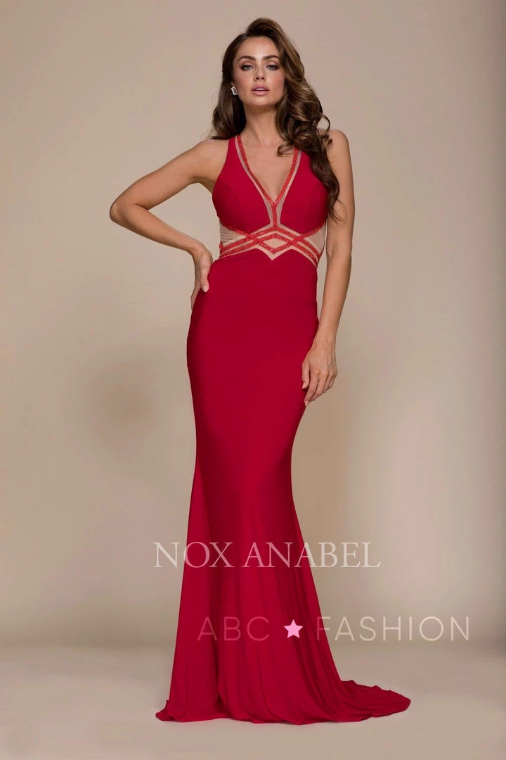 Rock this red deep V-neck gown with sheer glitter cutouts by Nox Anabel E037. This evening dress features a stunning V-neck bodice with red glittery illusion cutouts, eye-catching racerback, a full length skirt that flares to the floor to form a gorgeous sweep train, and a zipper closure. Affordably priced under $200, this dress is perfect for any formal event and will keep you on budget!