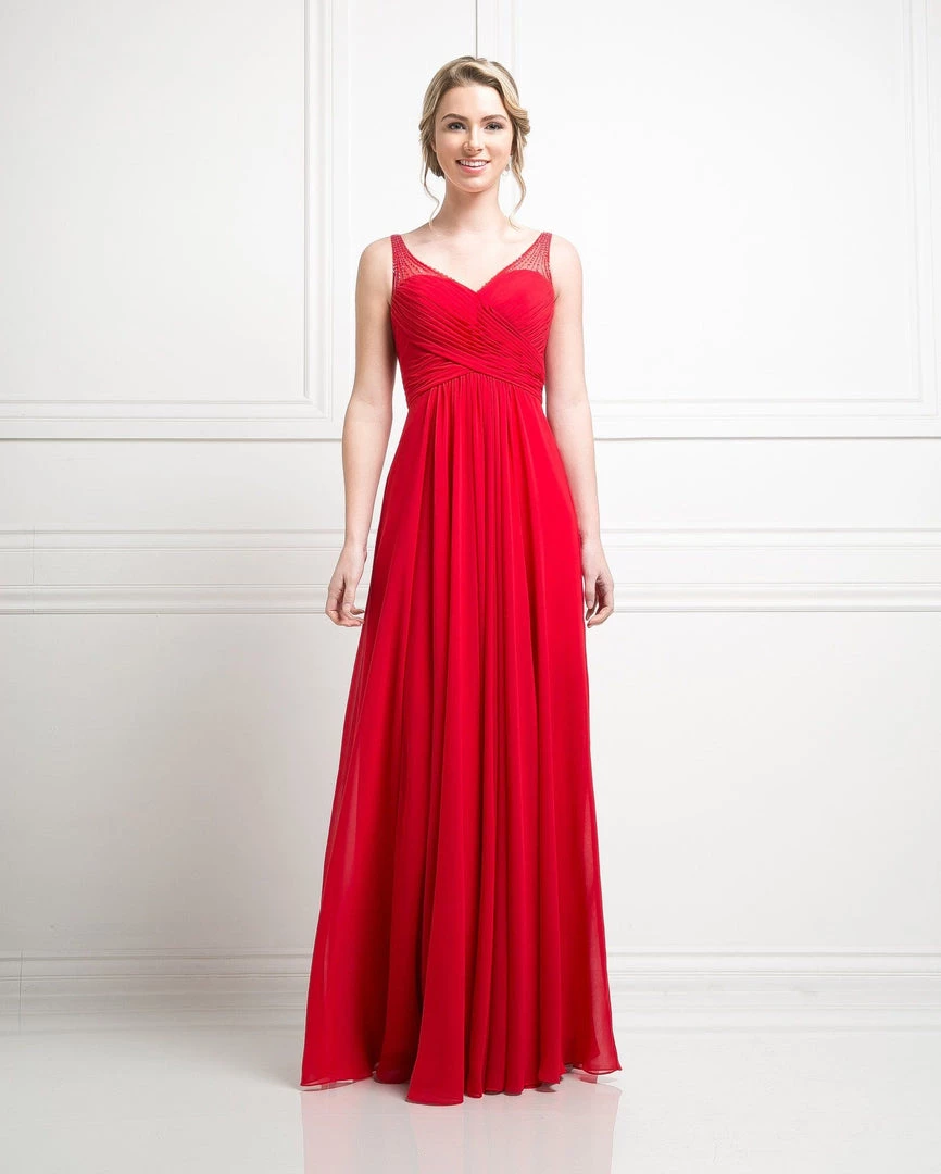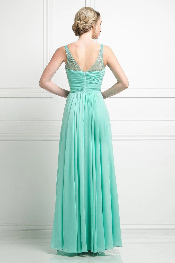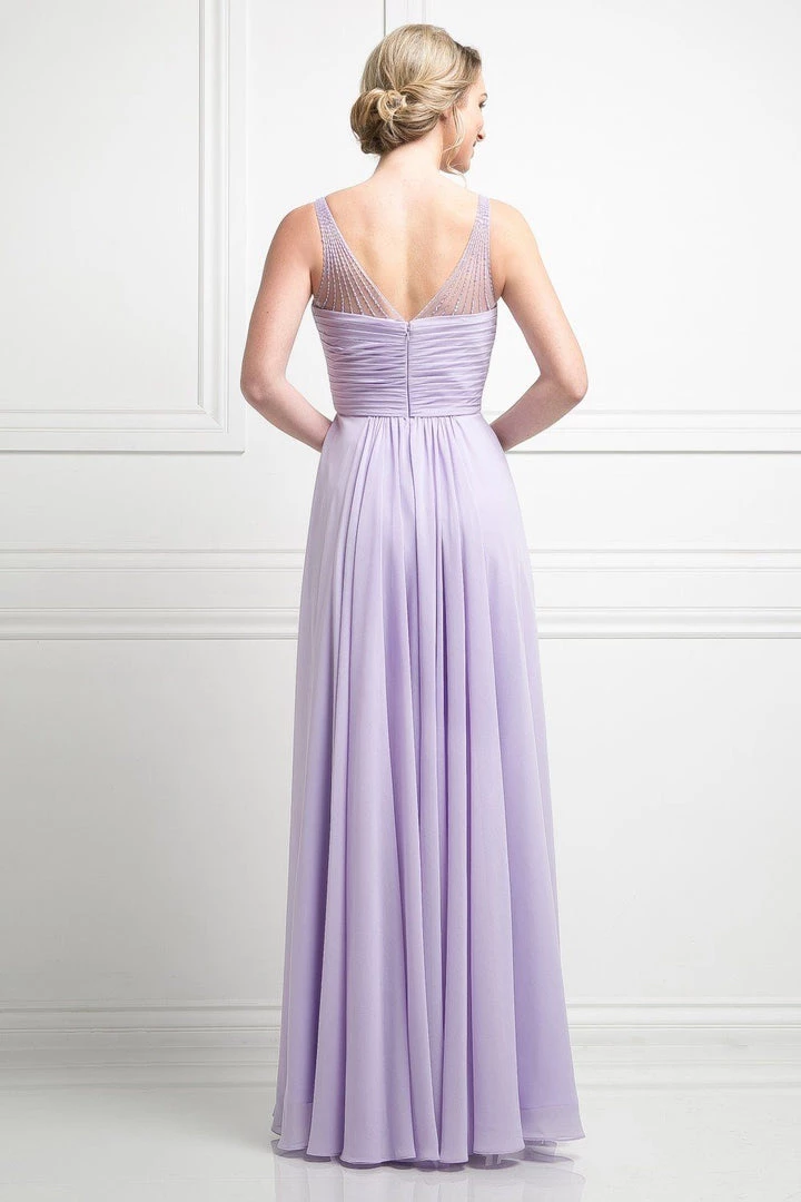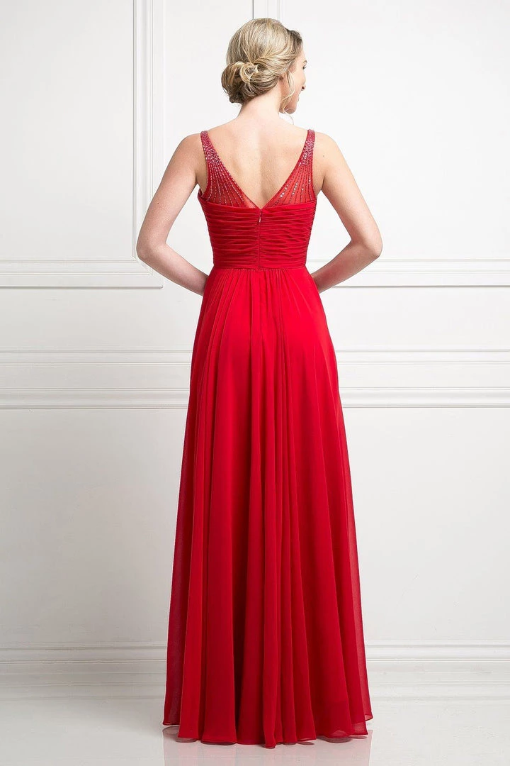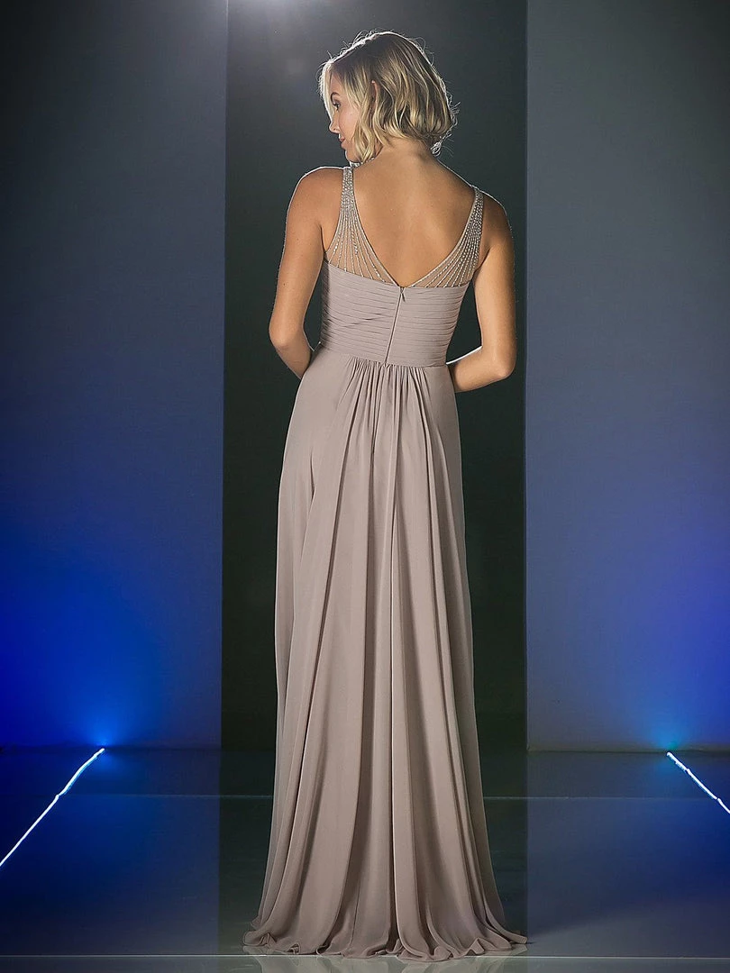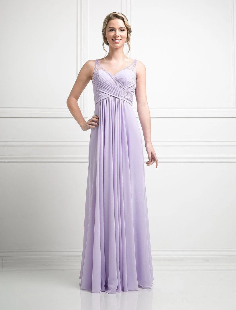 All eyes will be on you in this long sweetheart dress with beaded straps by Cinderella Divine CJ214. A ruched sweetheart bodice is accented with beaded sheer shoulder straps that extend to the V shaped back. There are pleats in the front and back of the chiffon floor length A-line skirt.