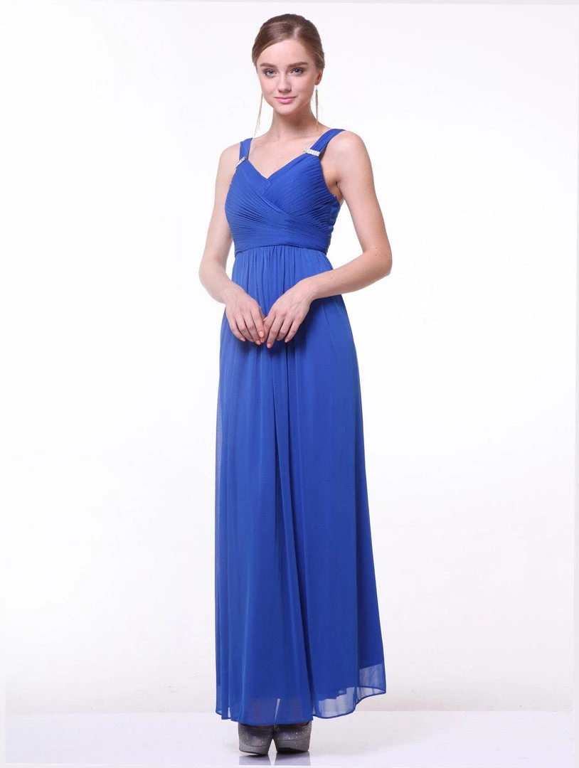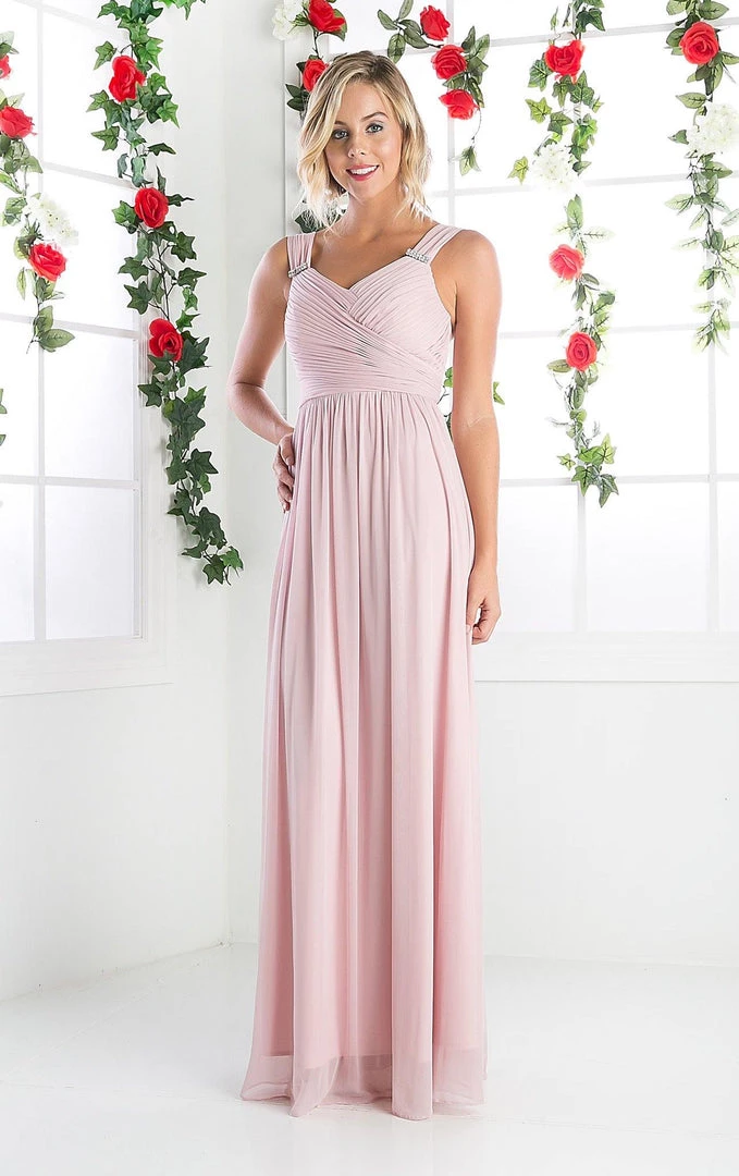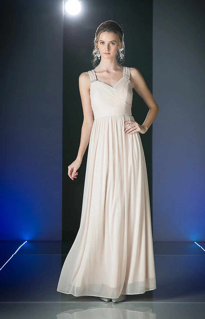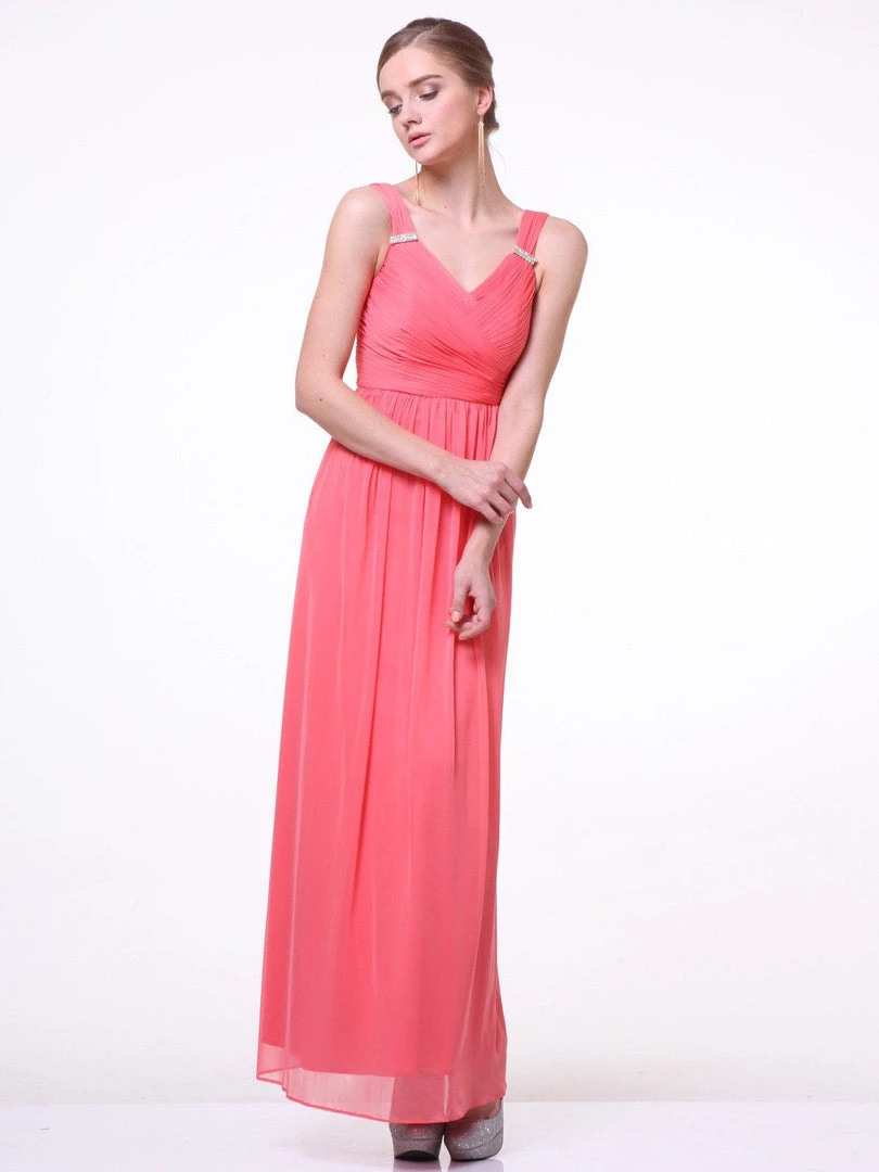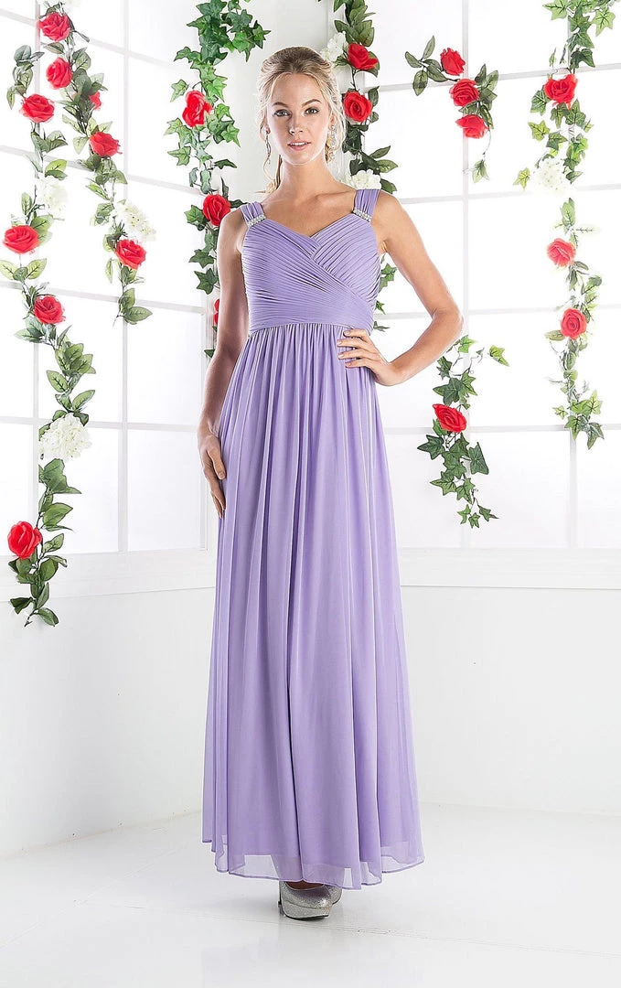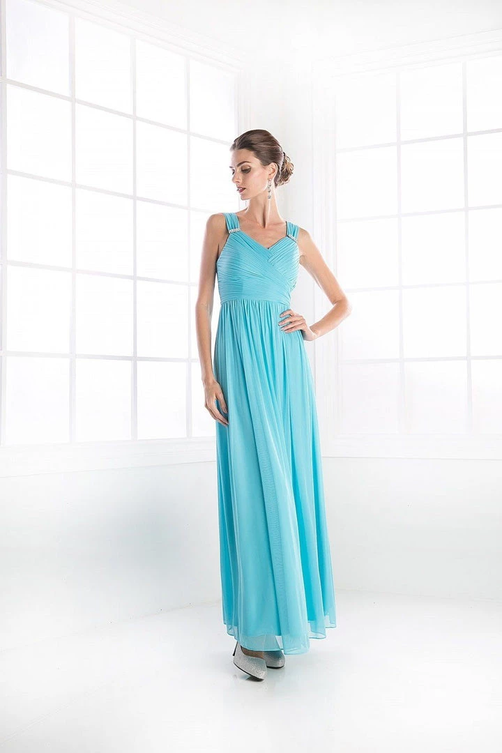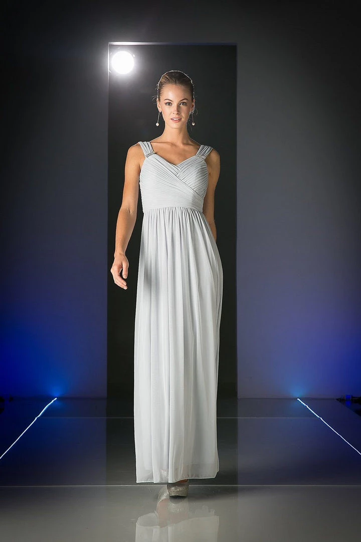 You’ll be the life of the party in this long V-neck dress with ruched bodice by Cinderella Divine 3984. This beautiful floor length A-line chiffon dress has ruching on the V-neck bodice and studded clasps on the sleeves for a touch of sparkle.
