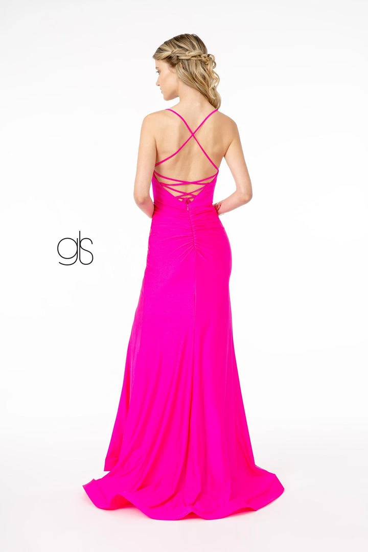Make a statement in this ruched long V-neck jersey dress with fitted skirt by Elizabeth K GL1816. Affordably priced at $180, this gown is perfect for any formal event and will keep you on budget!