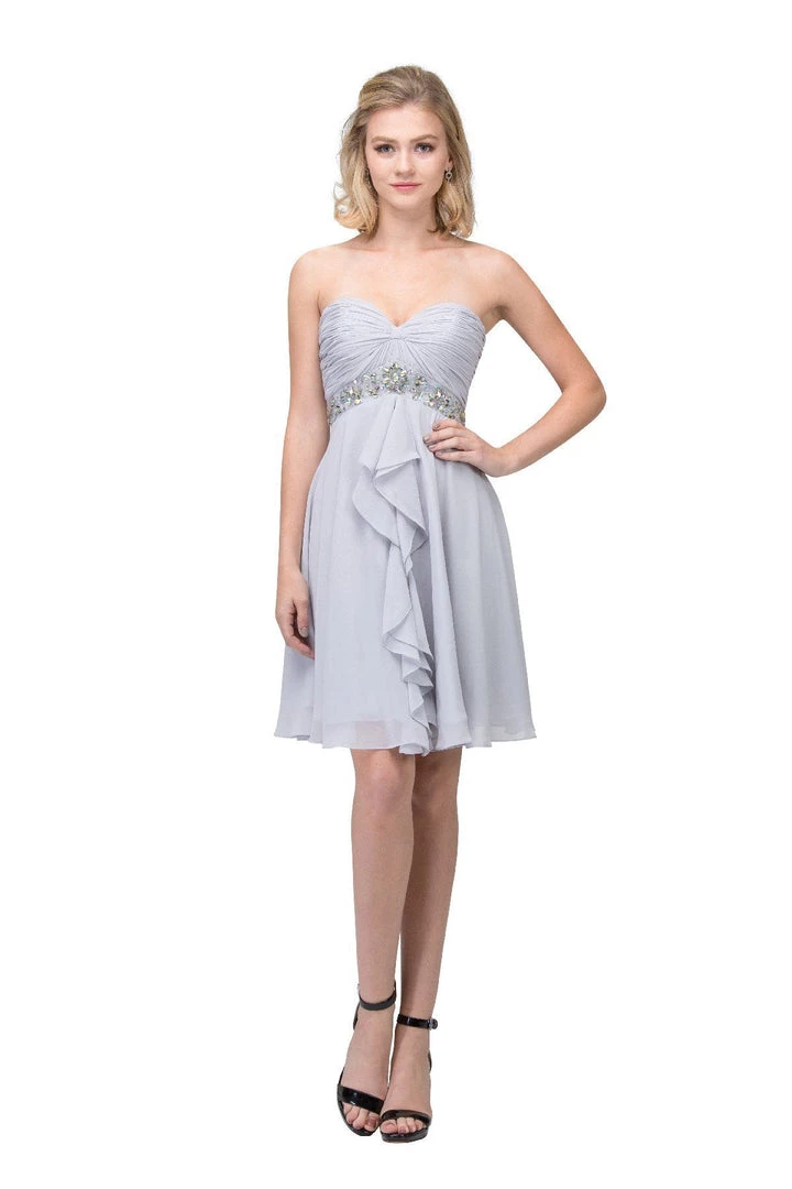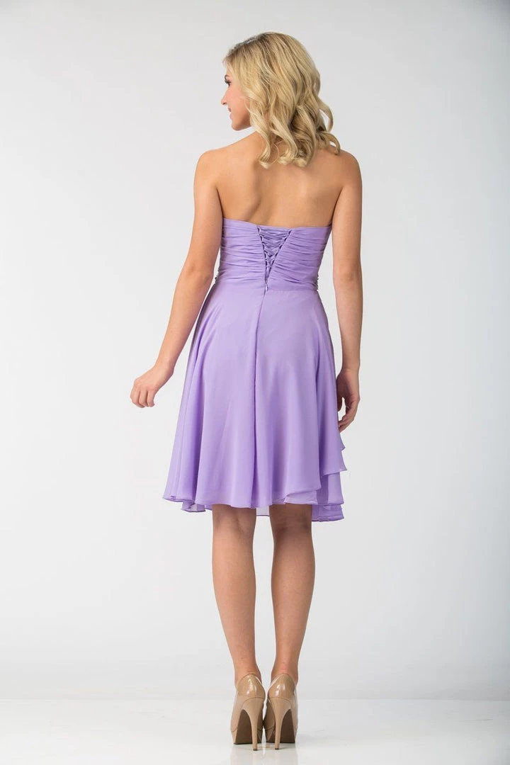 Make lasting memories in this ruched strapless sweetheart knee-length cocktail dress with corset back by Star Box 6069. This beautiful short dress features a pleated strapless sweetheart bodice, beaded empire waist, front ruffle detail, short A-line skirt that gracefully falls at the knees, and a lace-up corset back with zipper closure. Affordably priced at $130, this short party dress is perfect for any formal event and will keep you on budget!