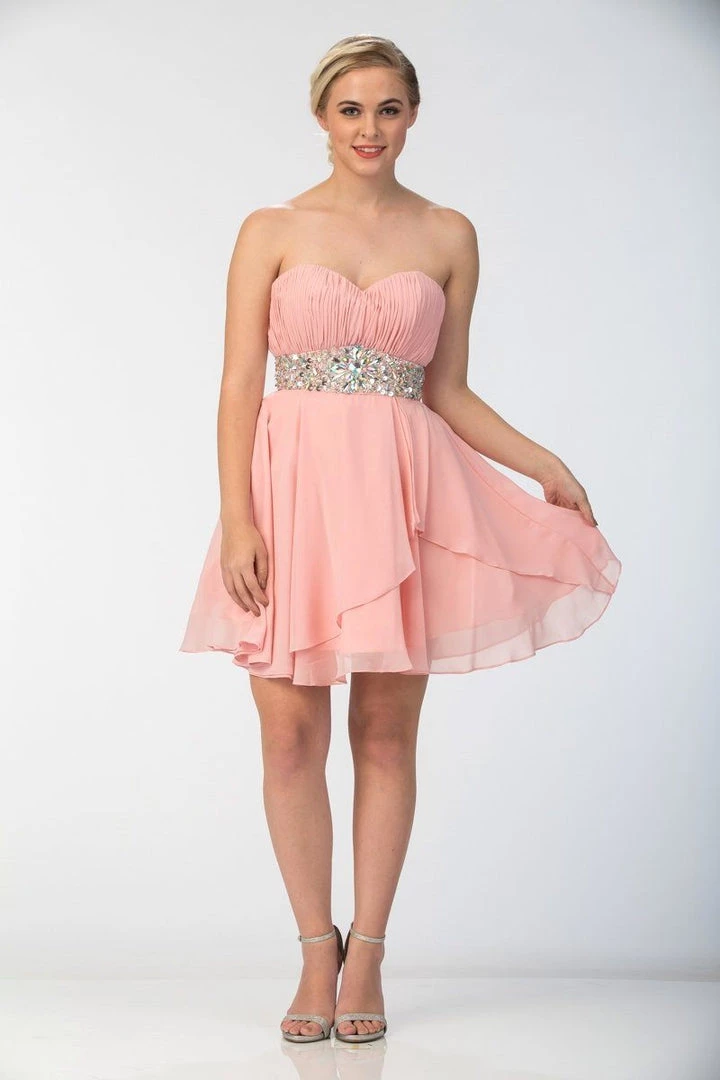 Dance the night away in this ruched strapless sweetheart knee-length cocktail dress with corset back by Star Box 6068. This beautiful short dress features a pleated strapless sweetheart bodice, beaded empire waist, short A-line skirt that gracefully falls above the knees, and a lace-up corset back with zipper closure. Affordably priced at $130, this short party dress is perfect for any formal event and will keep you on budget!