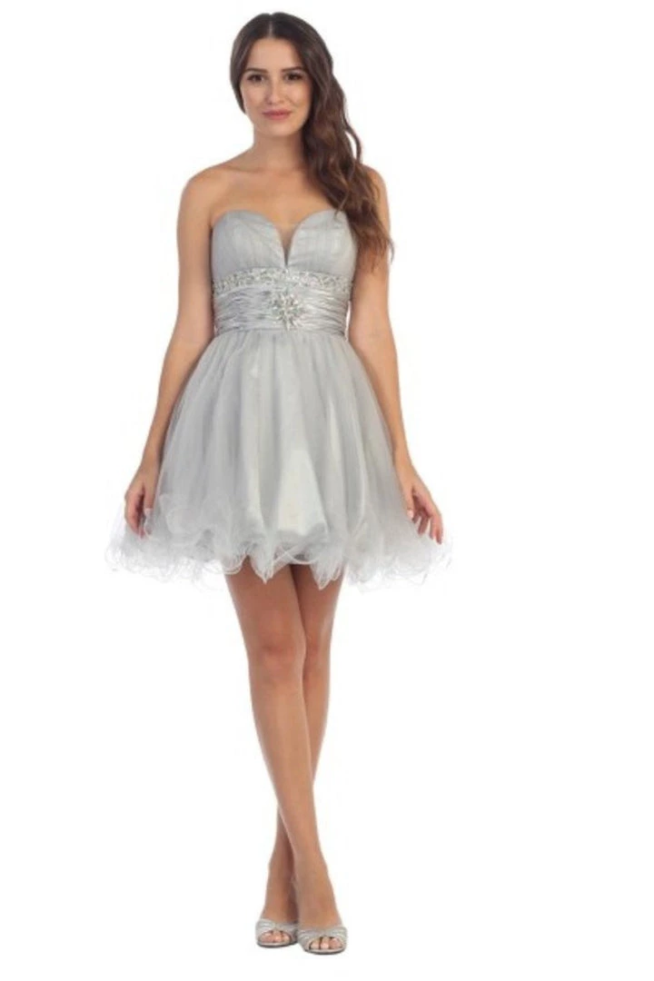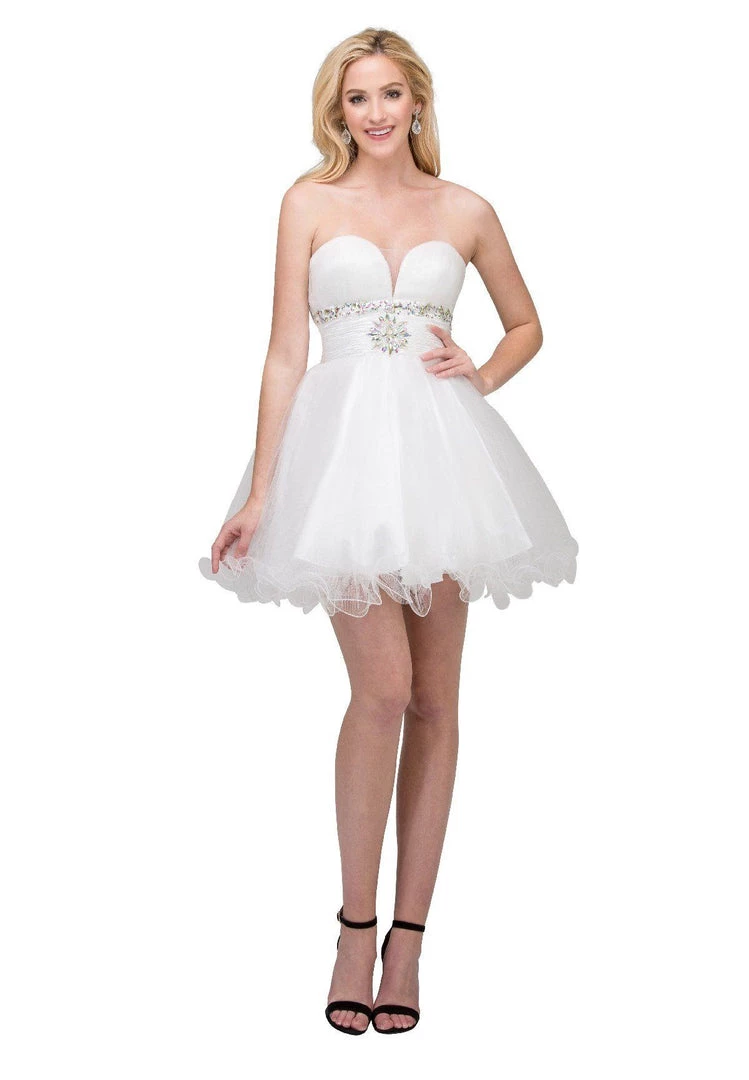Look glamorous in this ruffled strapless sweetheart cocktail dress with corset back by Star Box 6063-3. This beautiful short dress features a plunging strapless sweetheart bodice secured with a sheer inset panel, beaded details on the satin sash defines the waist, poofy short ruffled skirt with a curly hemline, and a lace-up corset back with zipper closure. Affordably priced under $150, this short party dress is perfect for any formal event and will keep you on budget!