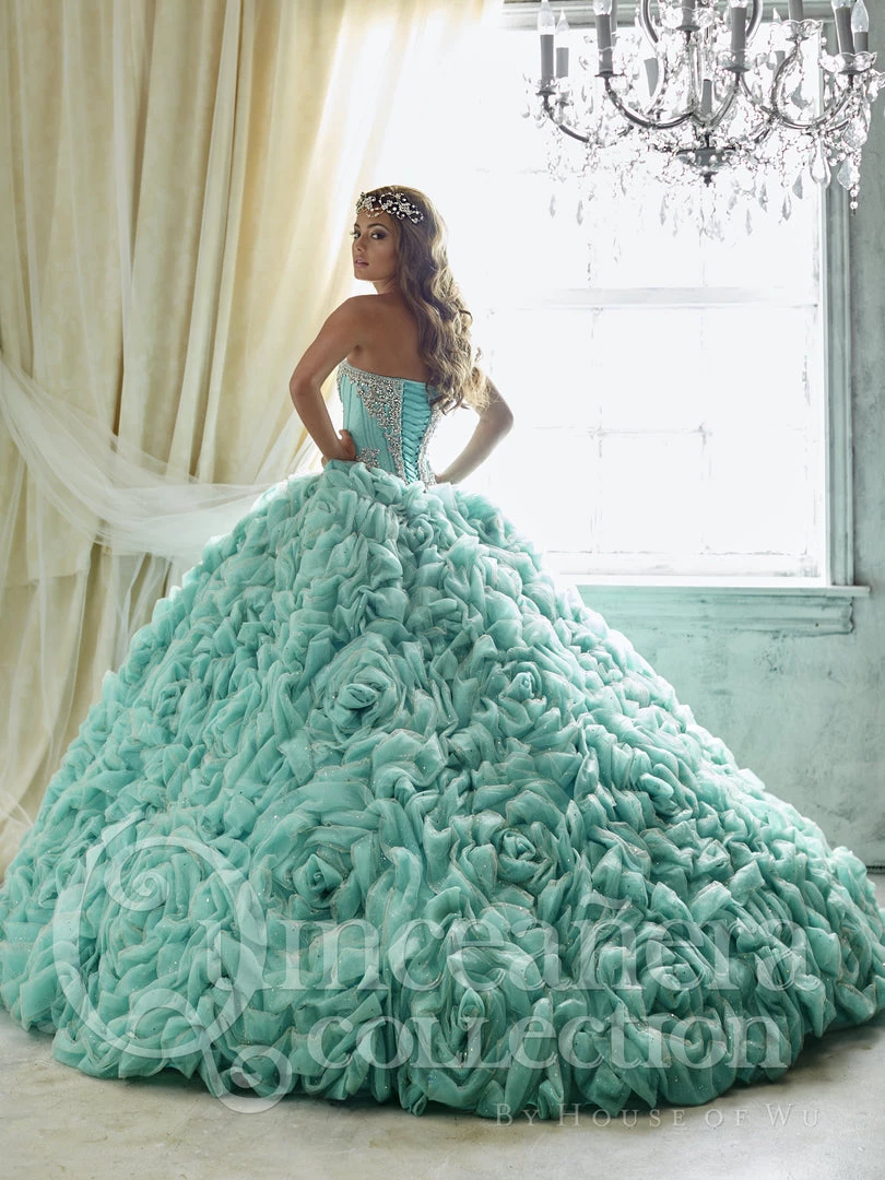 Captivate the room in this beaded long strapless sweetheart dress with ruffled rosette A-line skirt by House of Wu Quinceanera Collection 26800. Make heads turn in this beautiful ball gown made from sparkle tulle done in a rosette layout and endowed with a finely beaded bodice. Complete with lace-up corset and sweep train.