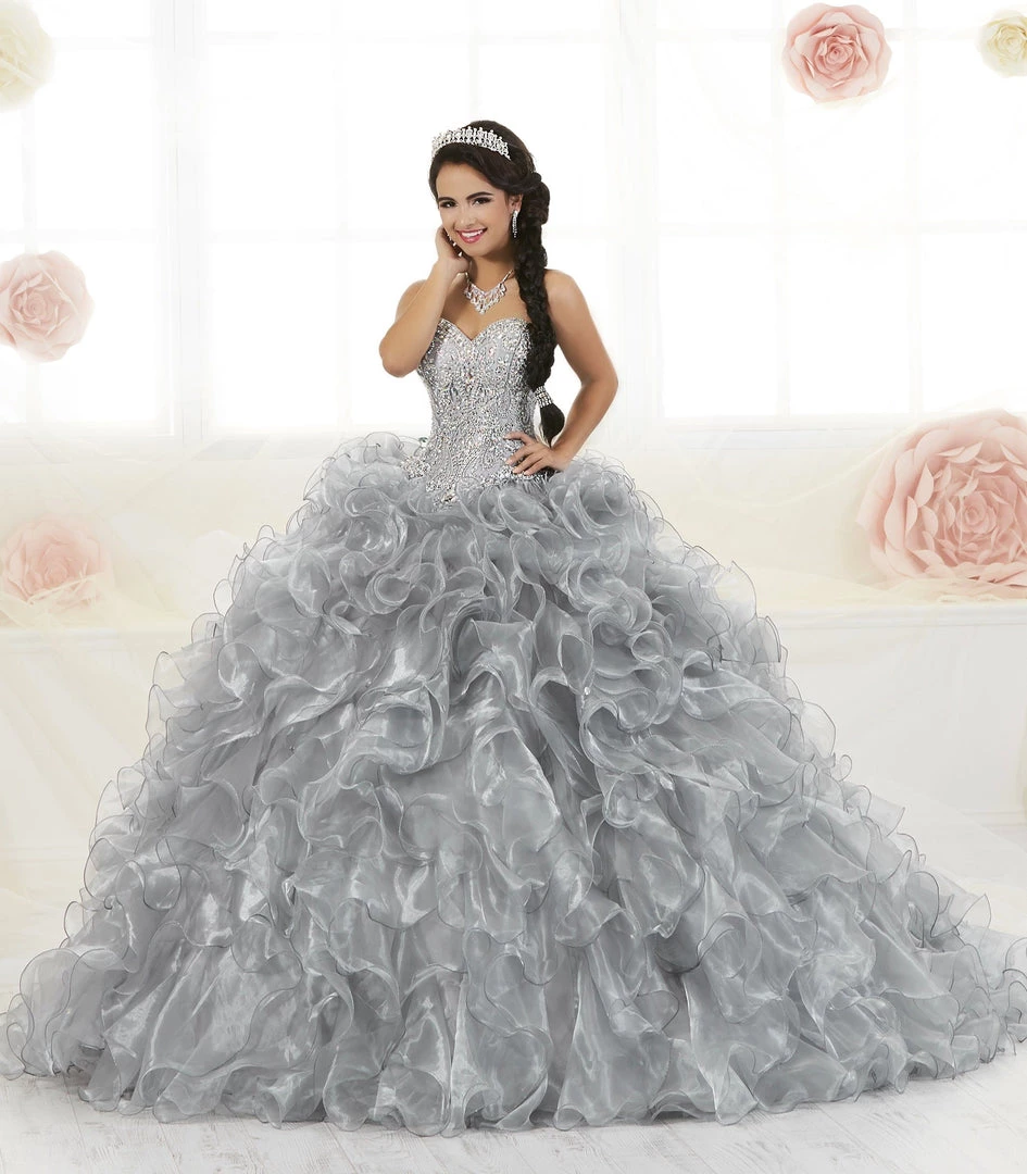 Make a grand entrance in this beaded long strapless sweetheart dress with A-line ruffled skirt by House of Wu Quinceanera Collection 26833. This ball gown features a full, ruffled organza skirt with small rhinestones sparsely decorating some of the wire-edge ruffles and a sweetheart bodice lavished in chunky bead work. A perfect beginning to any Quinceanera.