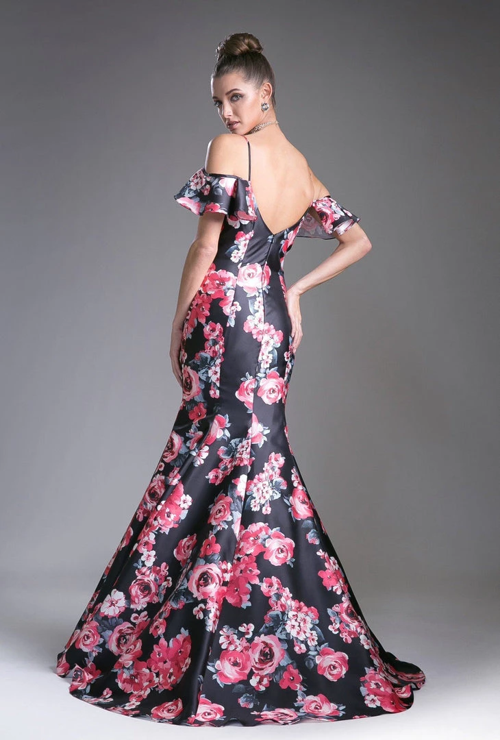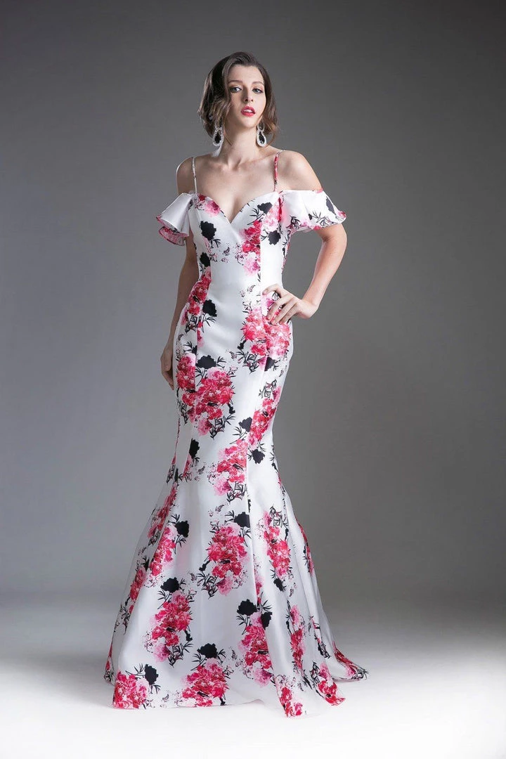 Look radiant in this cold shoulder floral print mermaid dress by Cinderella Divine 13043.