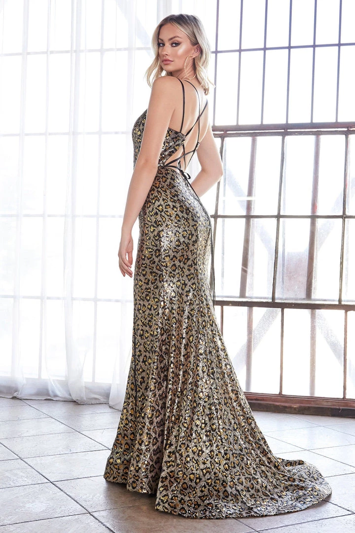 Show off your sexy side in this long fitted leopard print sequin dress with side slit by Cinderella Divine CD0159.
