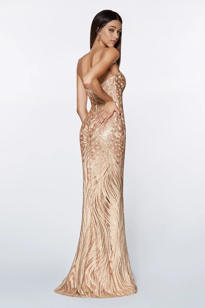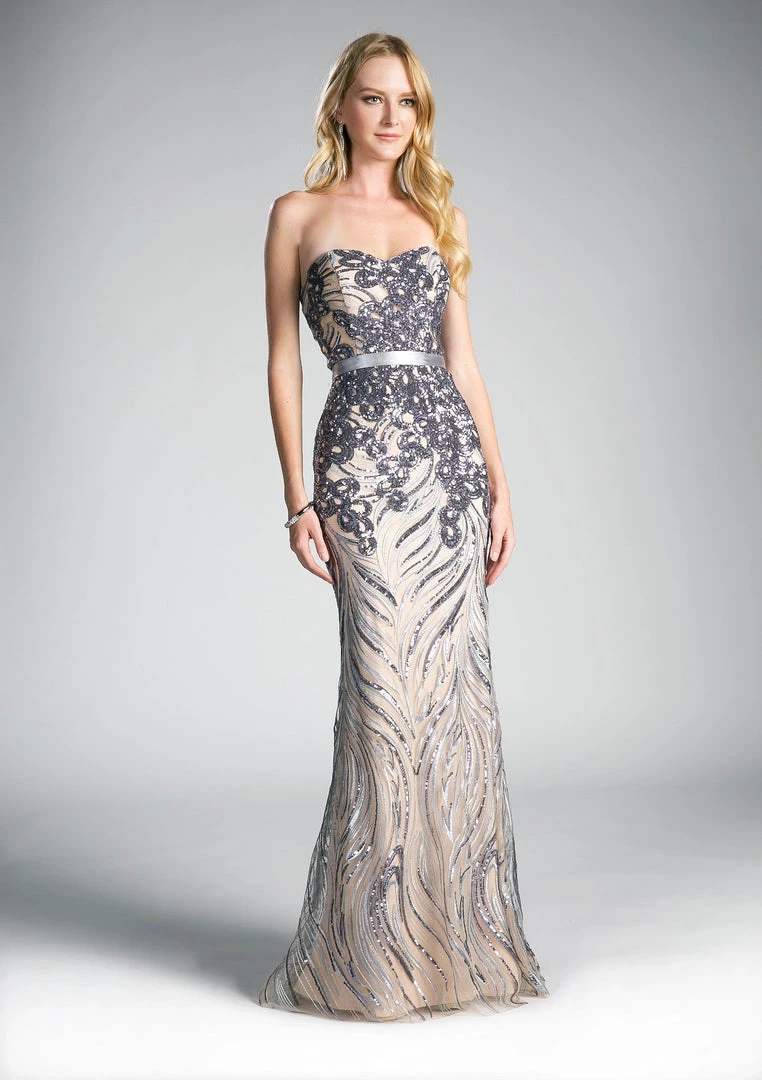Enjoy your night in this long strapless dress with sequins by Cinderella Divine CD0112. This evening gown features a sweetheart strapless bodice, beautiful sequined design all throughout the dress, satin waistband, floor length fitted skirt, and a zipper closure.