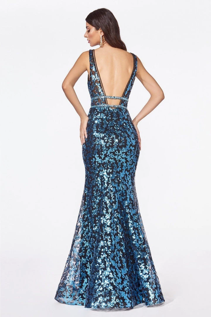 Light up the room in this long mermaid sequin pattern dress with open back by Cinderella Divine CM9171.