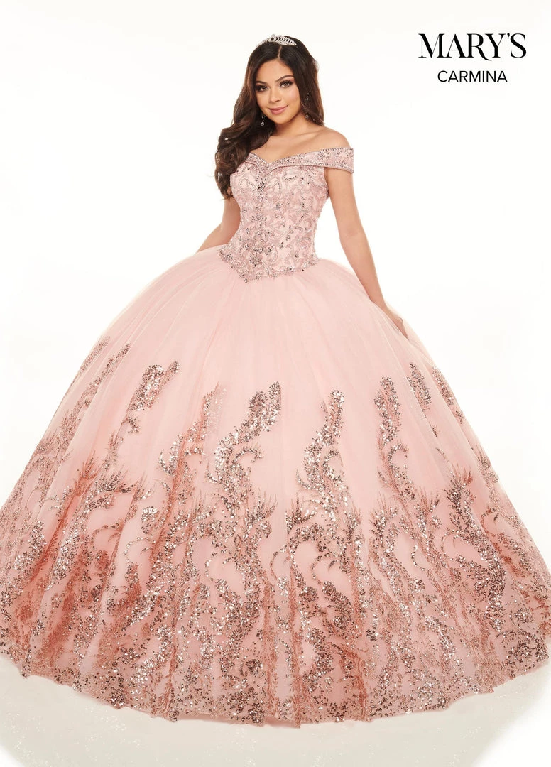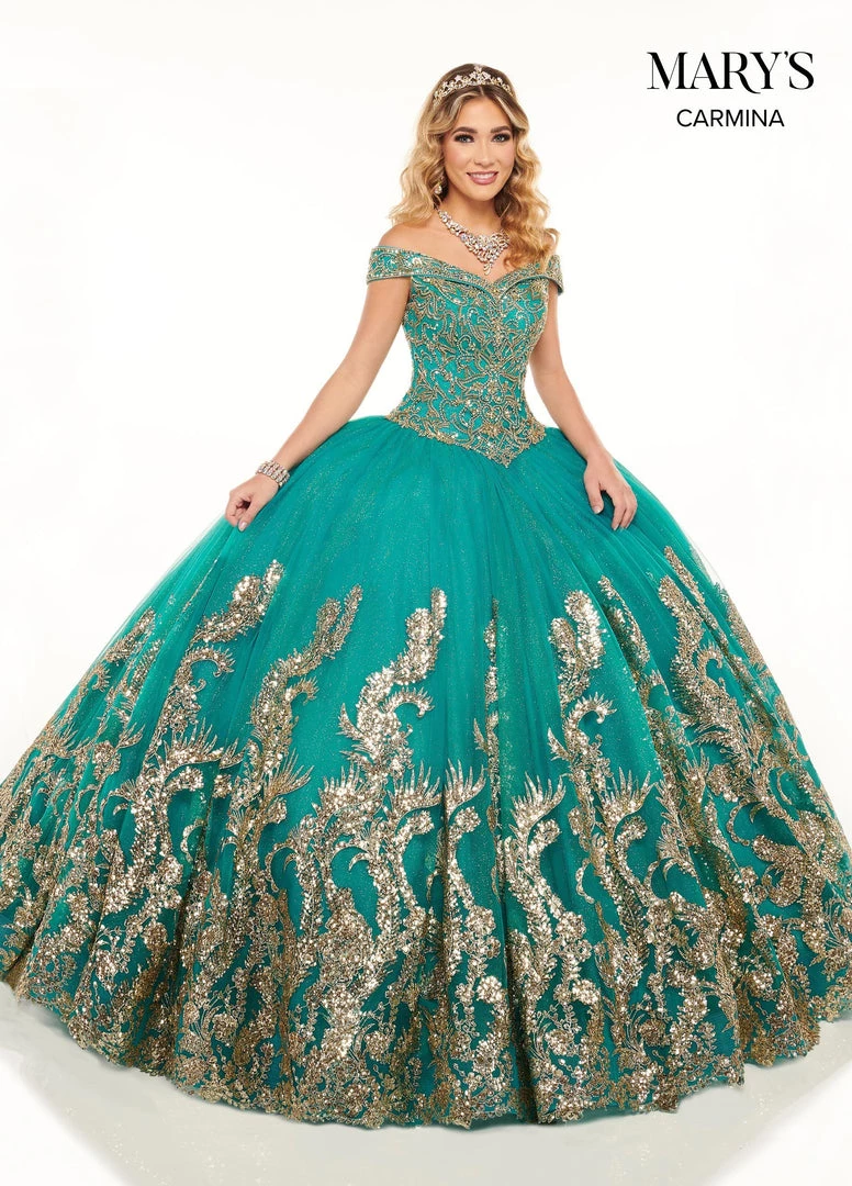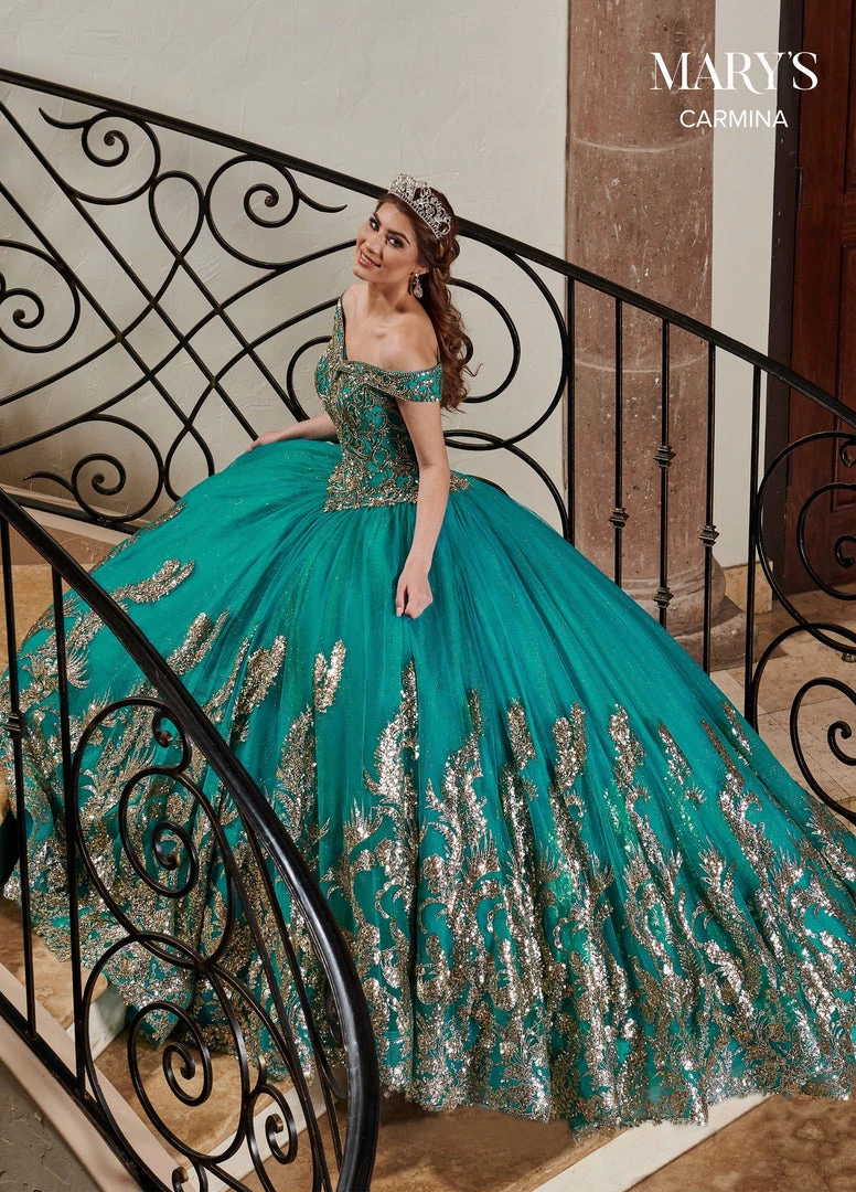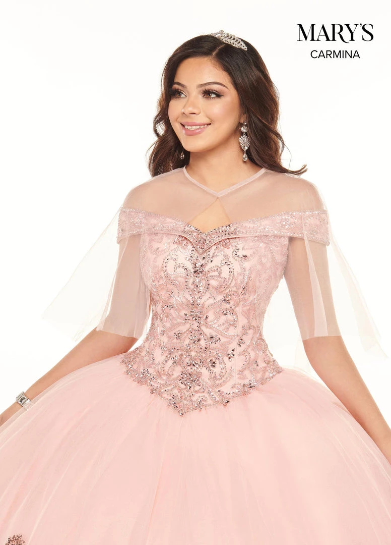 Look picture-perfect in this long off the shoulder dress with A-line sequin print skirt by Mary’s Bridal Quinceanera MQ1075. Off-the-shoulder tulle ball gown with a fully beaded bodice, basque waistline and full glitter tulle skirt. The gown finishes with an elaborate sequin applique hem, corset back, and sweep train. The matching cape is included.