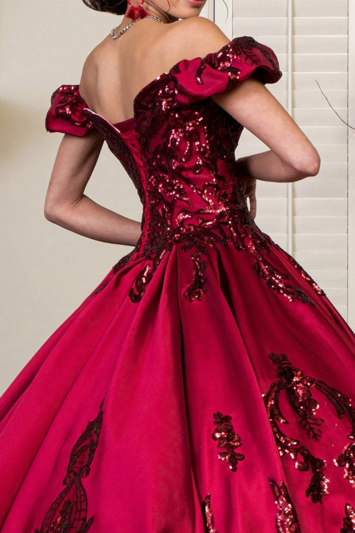 All eyes will be on you in this sequin print long off the shoulder satin dress with A-line skirt by Elizabeth K GL1913. This beautiful ballgown features a sweetheart neckline and off-shoulder with lovely puff sleeve and sparkly sequins.