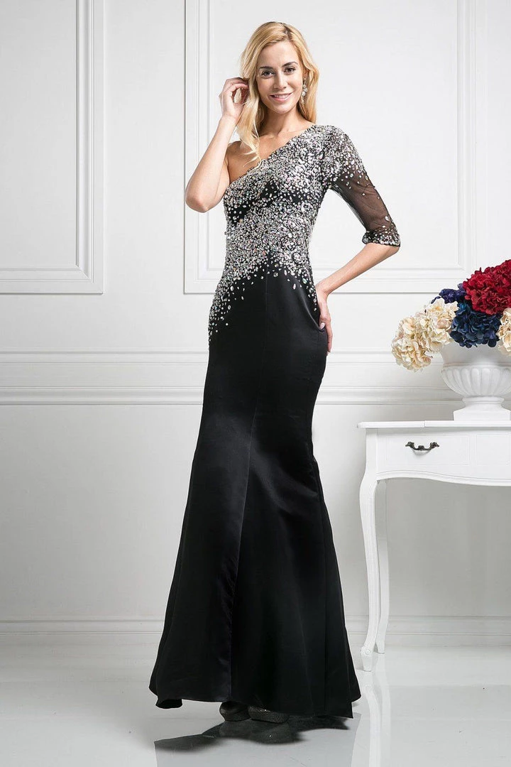 Sparkle under the stars in this sequined long one shoulder mermaid dress with single illusion sleeve by Cinderella Divine 8789.