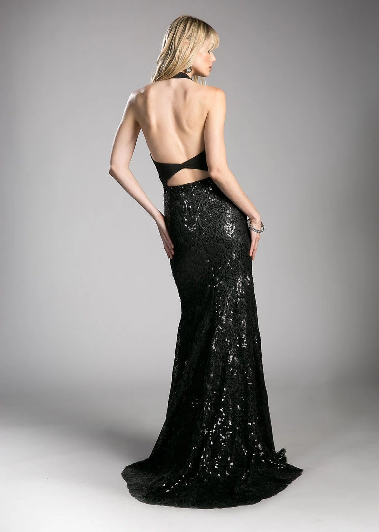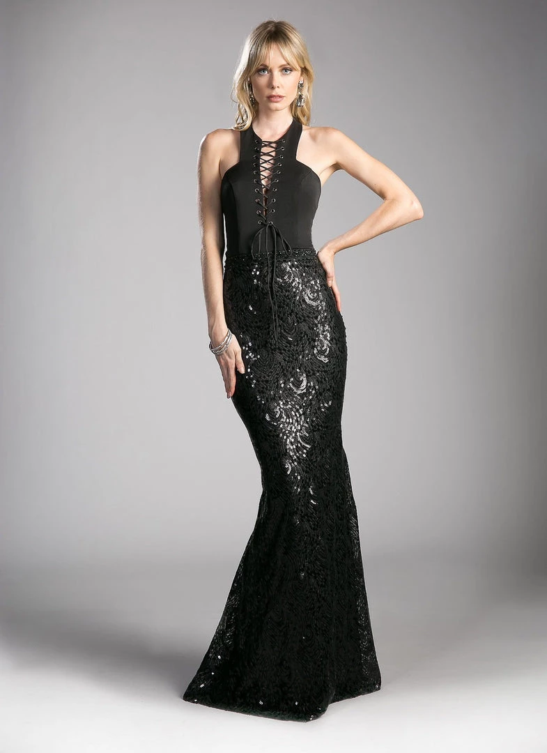 Enjoy your night in this long black halter formal dress with sequined skirt by Cinderella Divine 62495. This evening gown features a halter bodice adorned with lace-up straps, shimmery sequined design cover the skirt, a flirty open back, a floor length fit and flare skirt with a small train, and a zipper closure. Fitted sequin gown with halter neckline and lace up cut out.