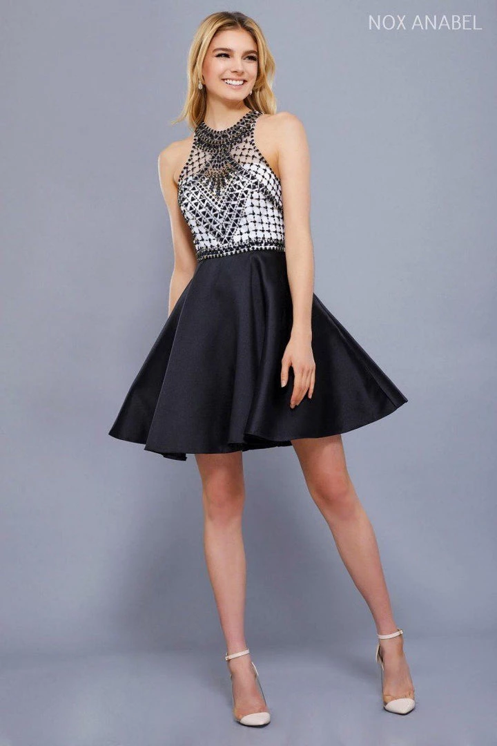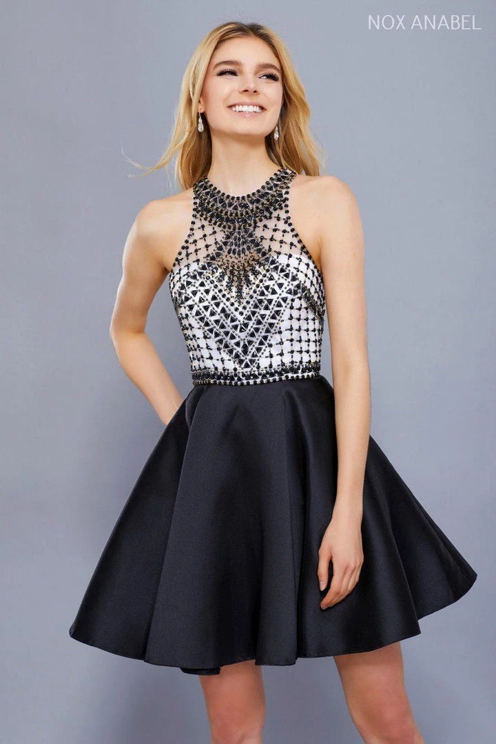 Fall in love with this short black cocktail dress with beaded illusion bodice by Nox Anabel Style Number 6243. This short cocktail dress features a high-neck sleeveless bodice designed with beautiful black and gold beads, sheer illusion neckline, short A-line skirt, embellished back, and a zipper closure. Perfect for any formal event!
