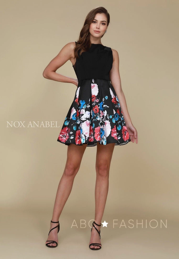 Be the center of attention in this short black cocktail dress with floral print skirt by Nox Anabel Q606. This short party dress features a black high-neck sleeveless bodice with an enticing illusion panels on the sides, flirty open back, a short box pleated A-line skirt is decorated with a vibrant floral print and gracefully flares out above the knees, and a zipper closure. Affordably priced under $150, this dress is perfect for any semi-formal event and will keep you on budget!
