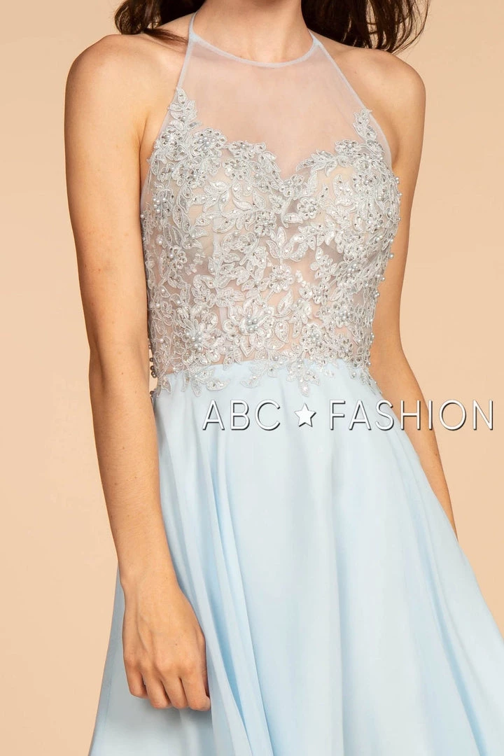 Dance the night away in this sky blue halter cocktail dress with sheer embroidered bodice by Elizabeth K GS1613. This short party dress features a high-neck halter illusion bodice adorned with beautiful floral embroidery accented with dainty beads, a flirty open back, a short A-line chiffon skirt gently falls at the knees, and a zipper back. Affordably priced at $140, this dress is perfect for any semi-formal event and will keep you on budget!