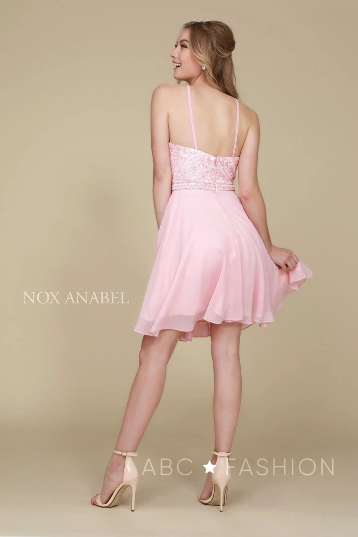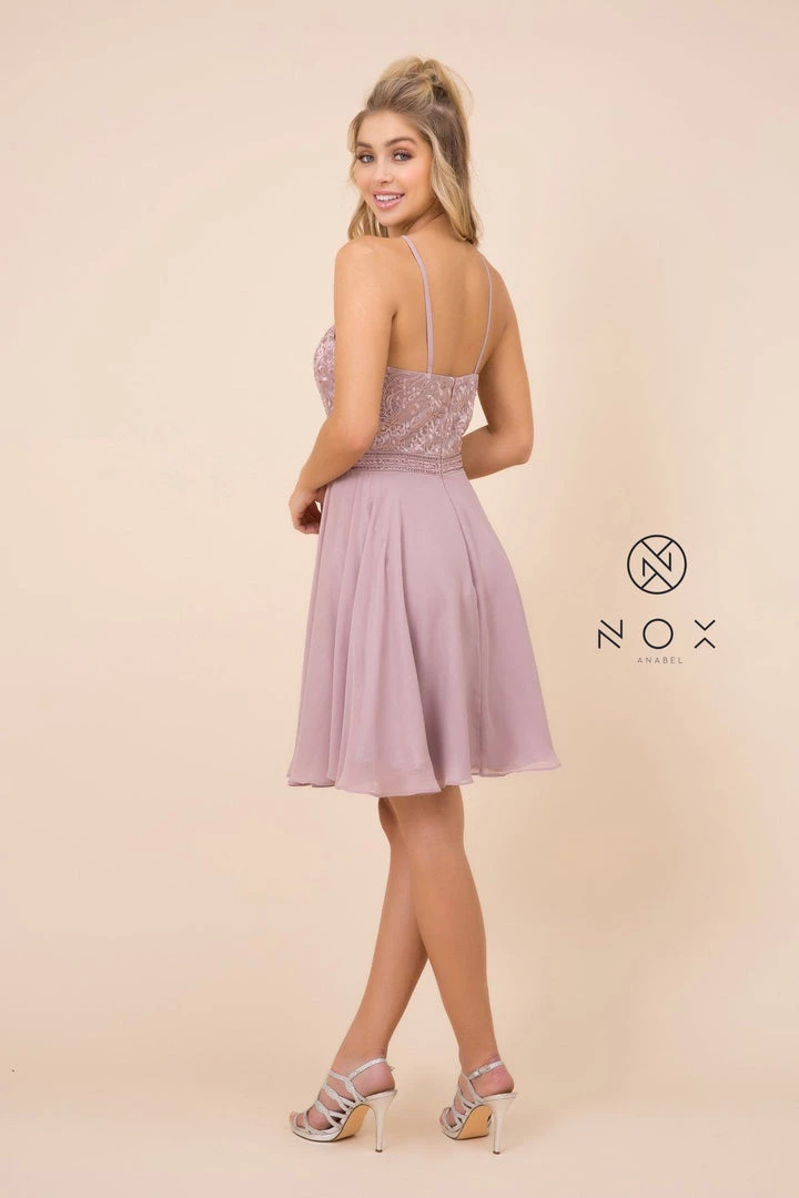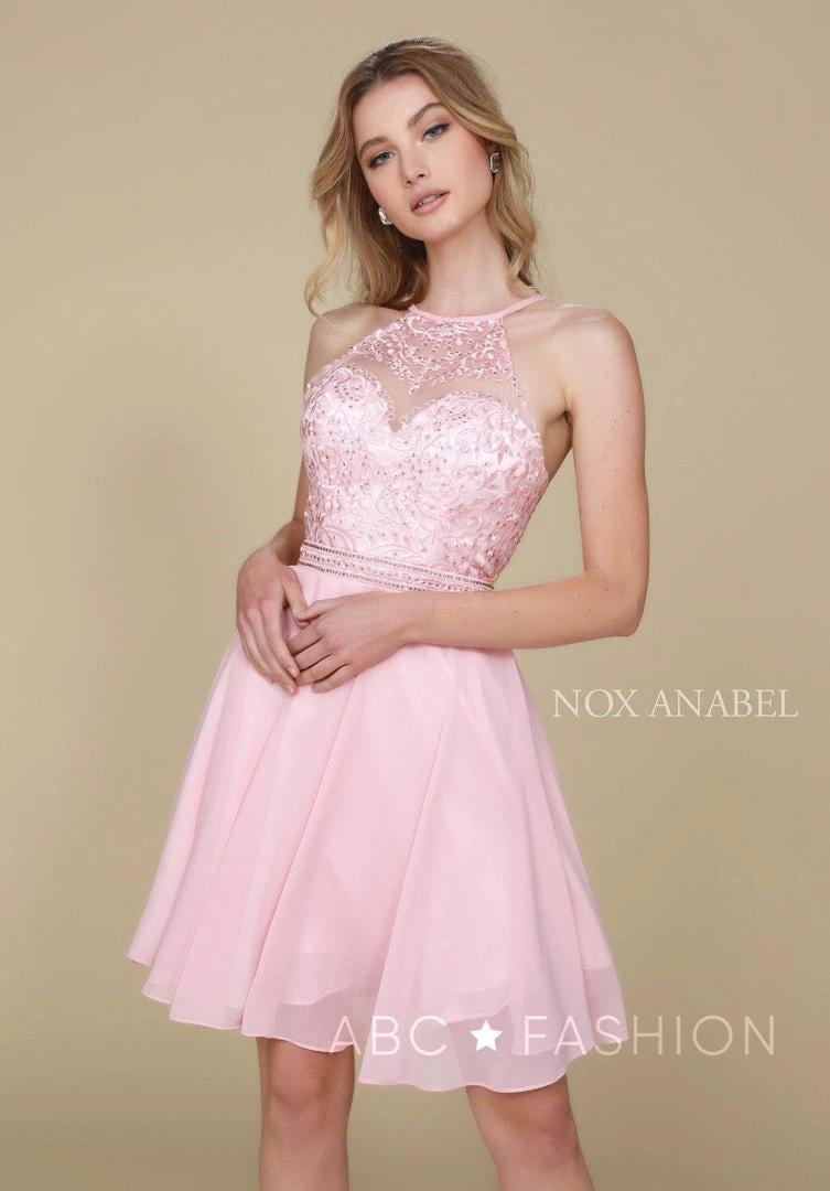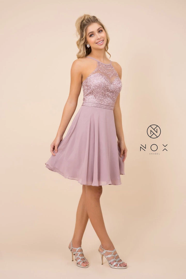 Turn heads in this fashionable short chiffon cocktail dress with embroidered top by Nox Anabel Y629. This short party dress features a chic racer-front high neckline that’s embroidered with curly floral designs, sheer mesh at the high neckline, flirty open back, a short A-line skirt that gracefully falls above the knees, and a zipper closure. Affordably priced at $120, this dress is perfect for any semi-formal event and will keep you on budget!