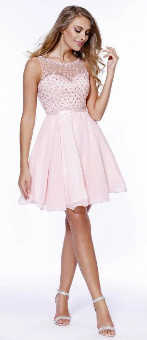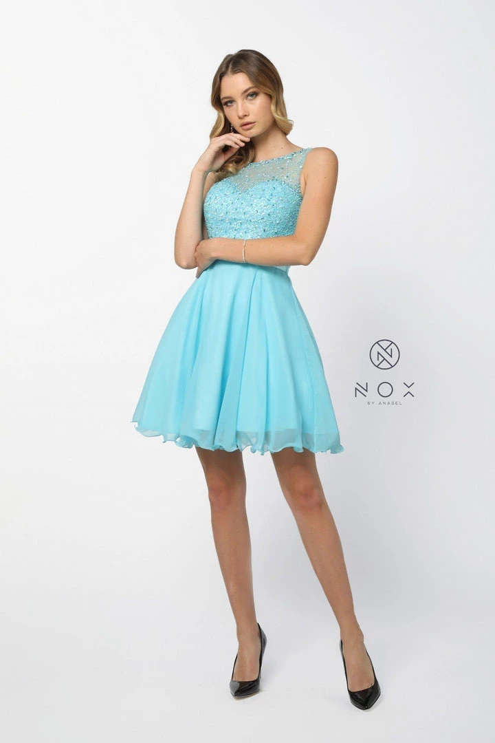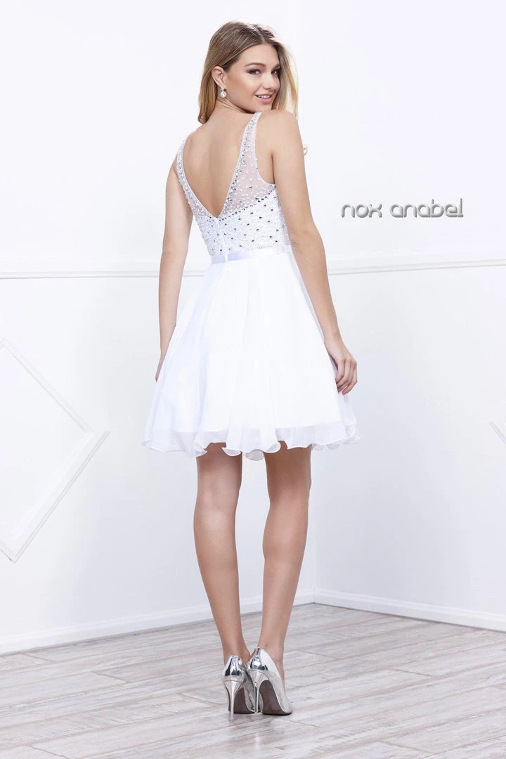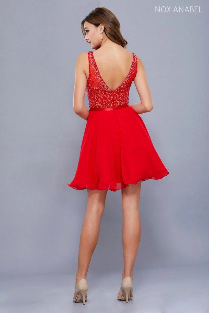 Dance the night away in this chiffon cocktail dress with sequined illusion bodice by Nox Anabel Style Number 6163. This short party dress features a sheer illusion sleeveless bodice adorned with sparkly sequins, satin waistband, V-shaped back, short A-line skirt, and a zipper closure. Perfect for any semi-formal event!