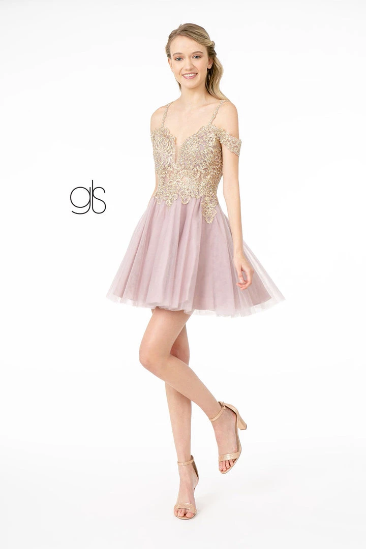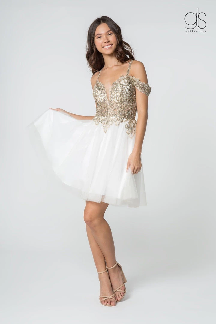 All eyes will be on you in this gold applique short cold shoulder A-line dress with illusion bodice by Elizabeth K GS2808.