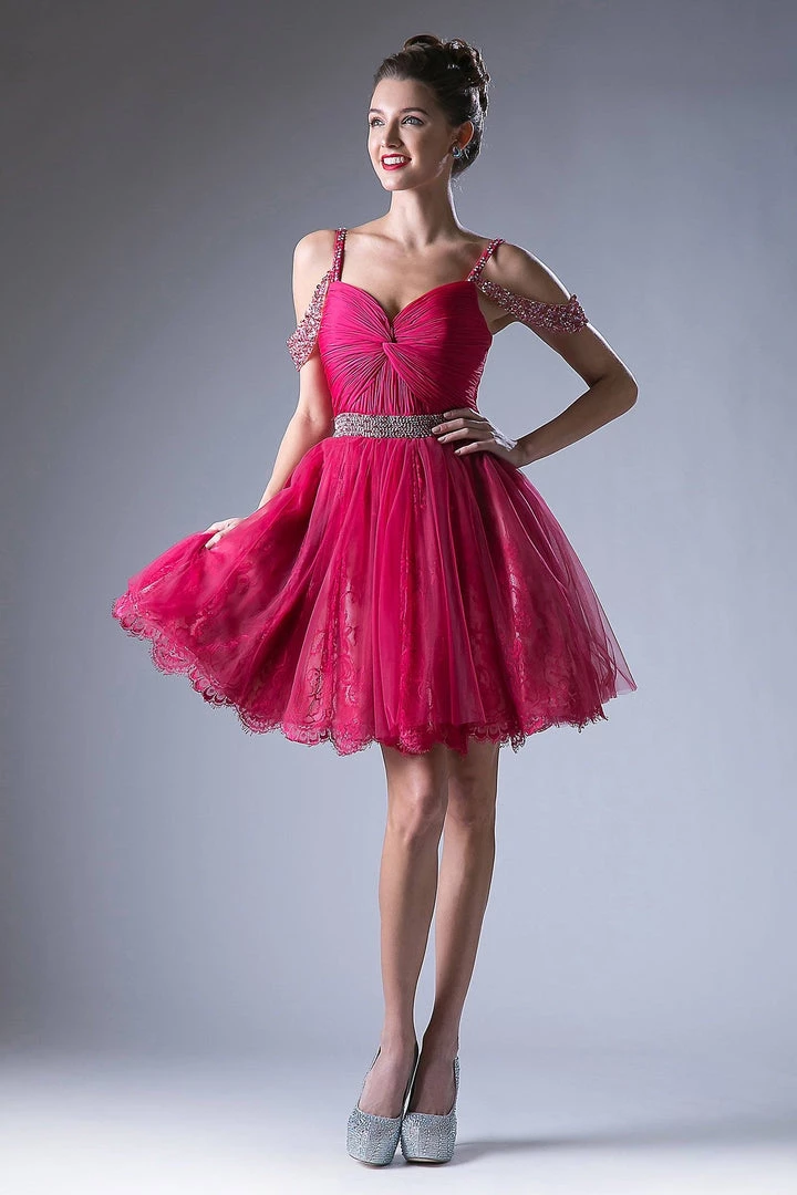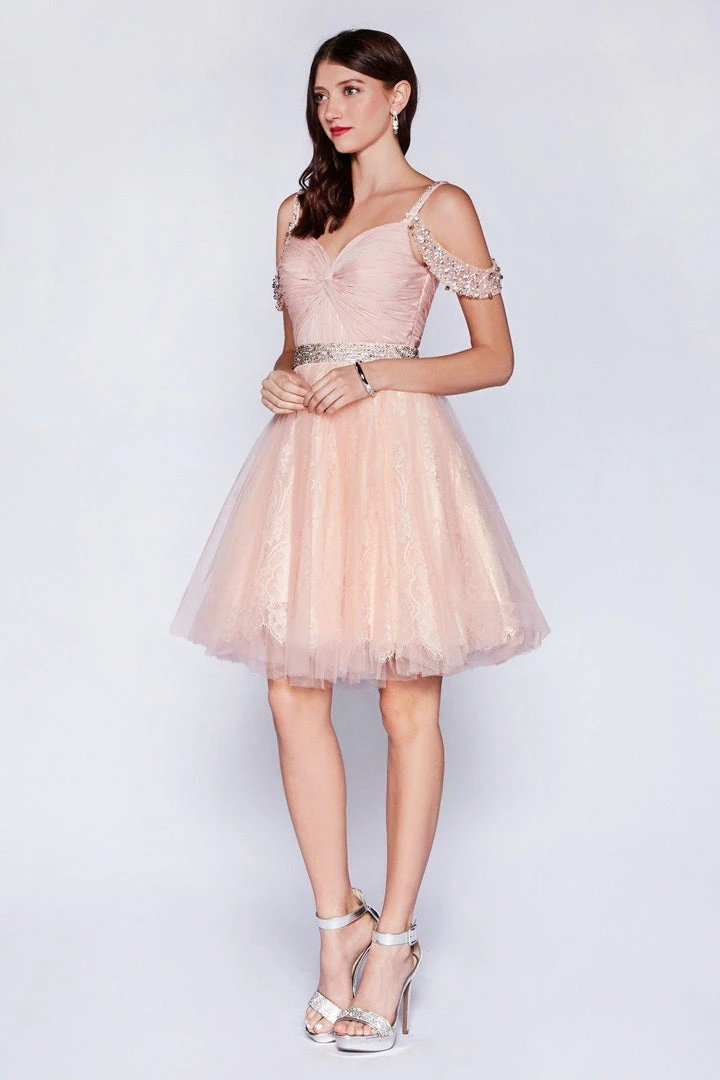 Dance the night away in thisĀ in this beautiful cold shoulder cocktail dress with lace underlay and tulle overlay skirt by Cinderella Divine 8947.