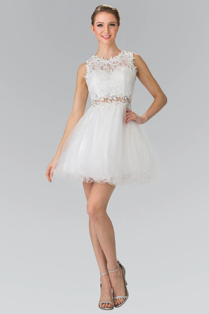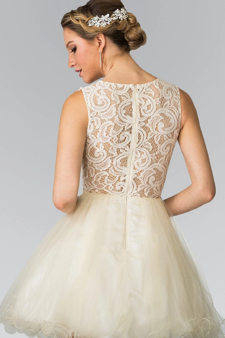 Think of how amazing you’ll look in this short sleeveless dress with lace bodice and sheer waistline by Elizabeth K.