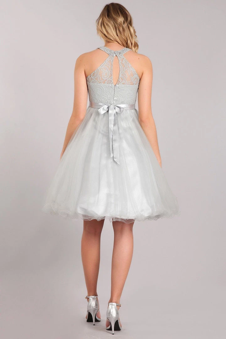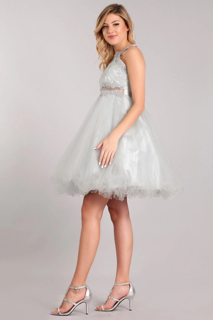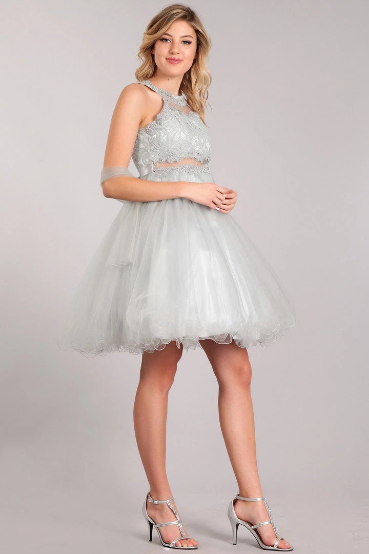 Be selfie ready in this short ruffled halter dress with sheer lace bodice by Cinderella Couture 5040X. Short halter dress in a fit and flare style with a lace bodice, illusion waistline, rhinestone design, solid pleated tulle skirt, ruffled hem, lace back with keyhole cutout, and back tie with a zipper closure. A matching scarf is included.