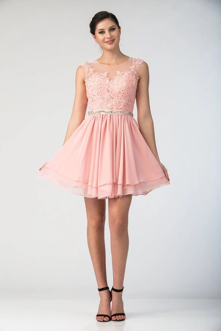 Be selfie-ready in this sleeveless chiffon cocktail dress with lace appliques by Star Box 6171. This beautiful short dress features an illusion boat neckline embroidered with floral lace appliques accented with sparkly rhinestones, beaded belt, sheer embellished back, short A-line skirt with layers, and a zipper closure. Affordably priced at $135, this short party dress is perfect for any formal event and will keep you on budget!