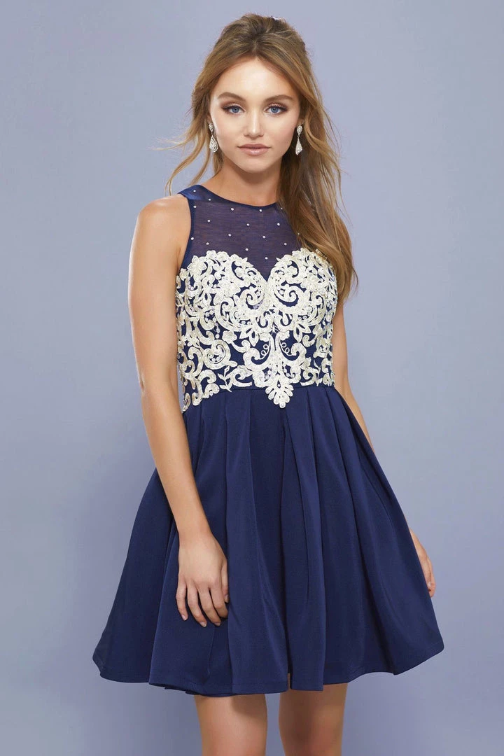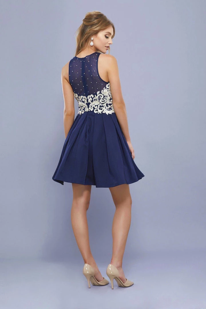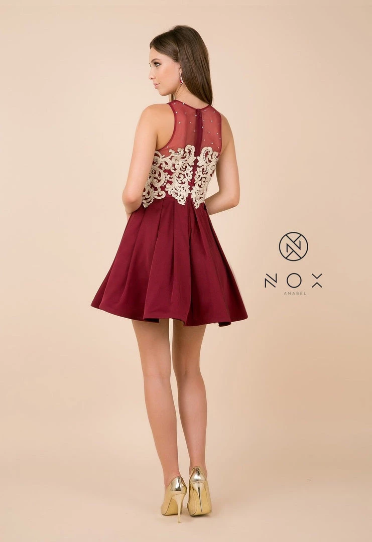 Slay the night away in this illusion cocktail dress with lace applique by Nox Anabel Style Number 6338 for an upcoming formal event. This short party dress features a sleeveless illusion bodice embellished with beautiful lace applique, a high neckline that’s accented with beads, a sheer back, a short A-line skirt, and a zipper closure. Perfect for any semi-formal event!