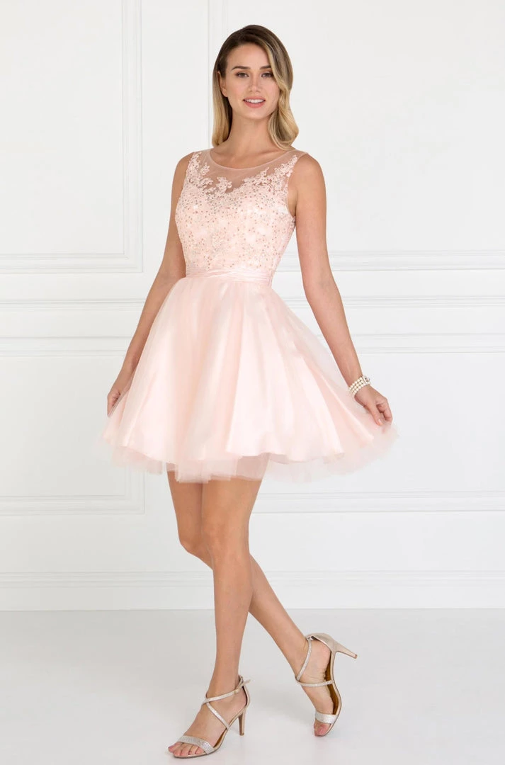Light up the room in this illusion cocktail dress with lace bodice by Elizabeth K GS2414. This short party dress features an illusion sleeveless bodice embellished with a lovely lace applique, sheer lace appliqued back, a lovely short A-line skirt, and a zipper back.