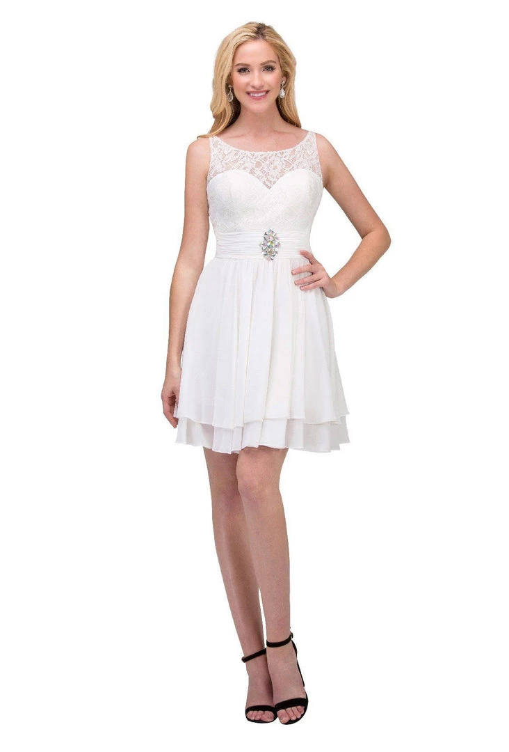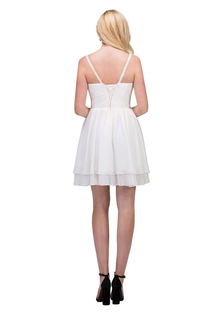 Turn heads in this sleeveless V-neck cocktail dress with lace bodice by Star Box 6146. This fetching short dress features a sleeveless lace bodice, sheer sweetheart neckline, a ruched sash adorned with a beaded detail, open back reveals thin straps, tiered chiffon short A-line skirt, and a zipper closure. Affordably priced under $140, this short party dress is perfect for any formal event and will keep you on budget!