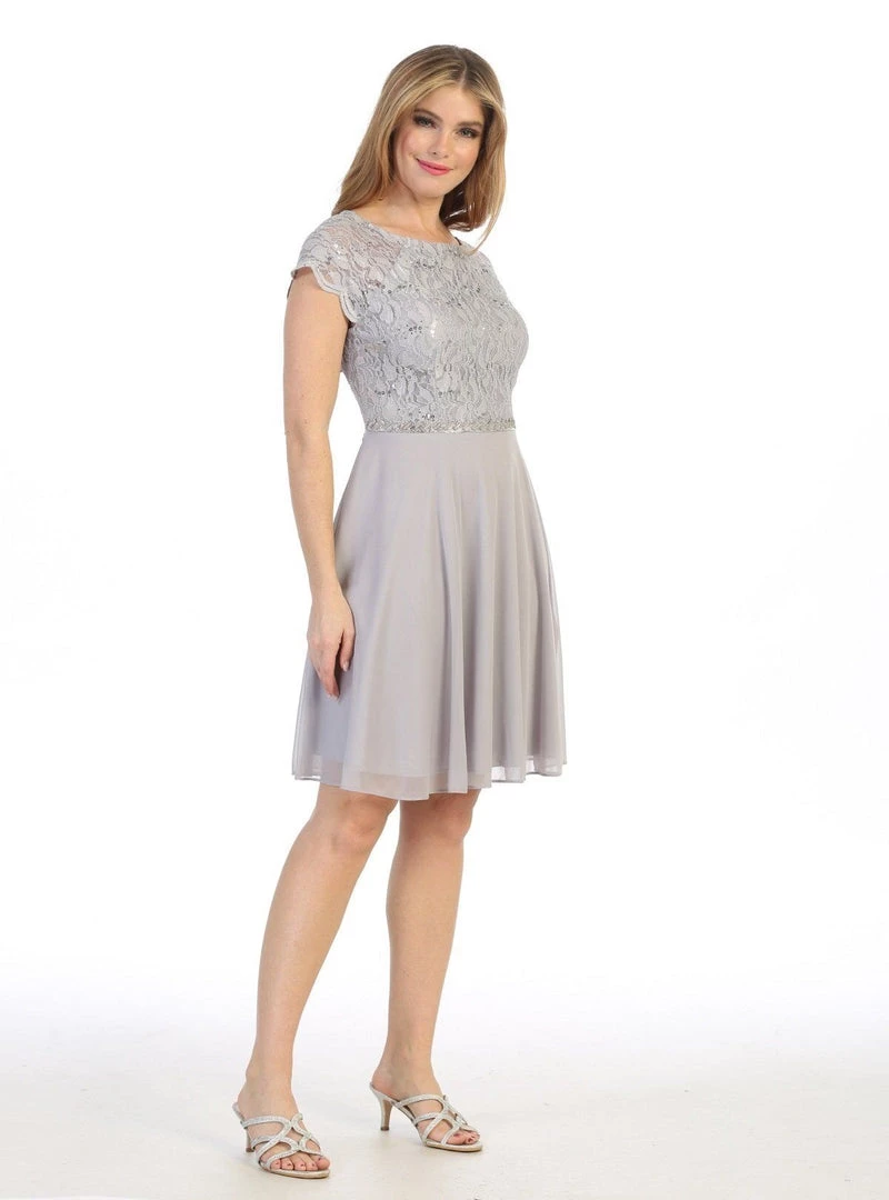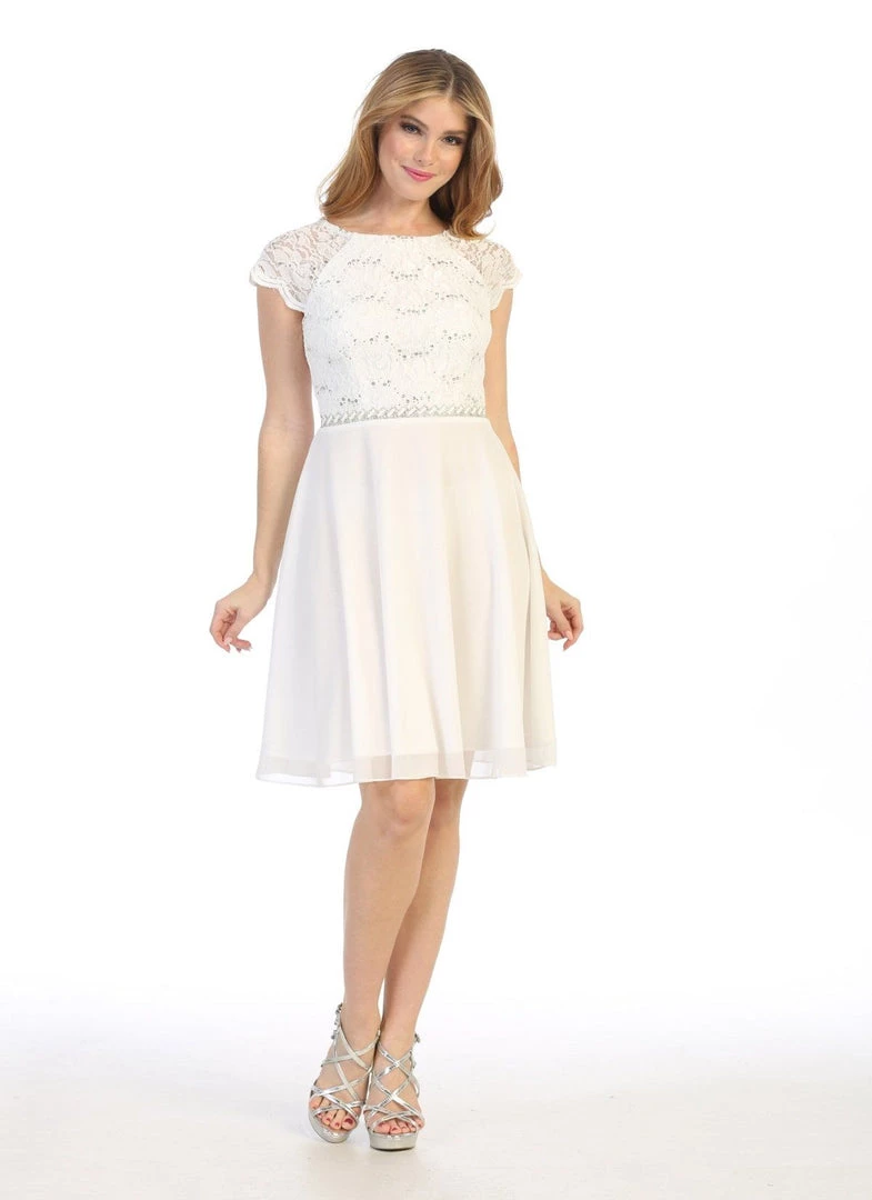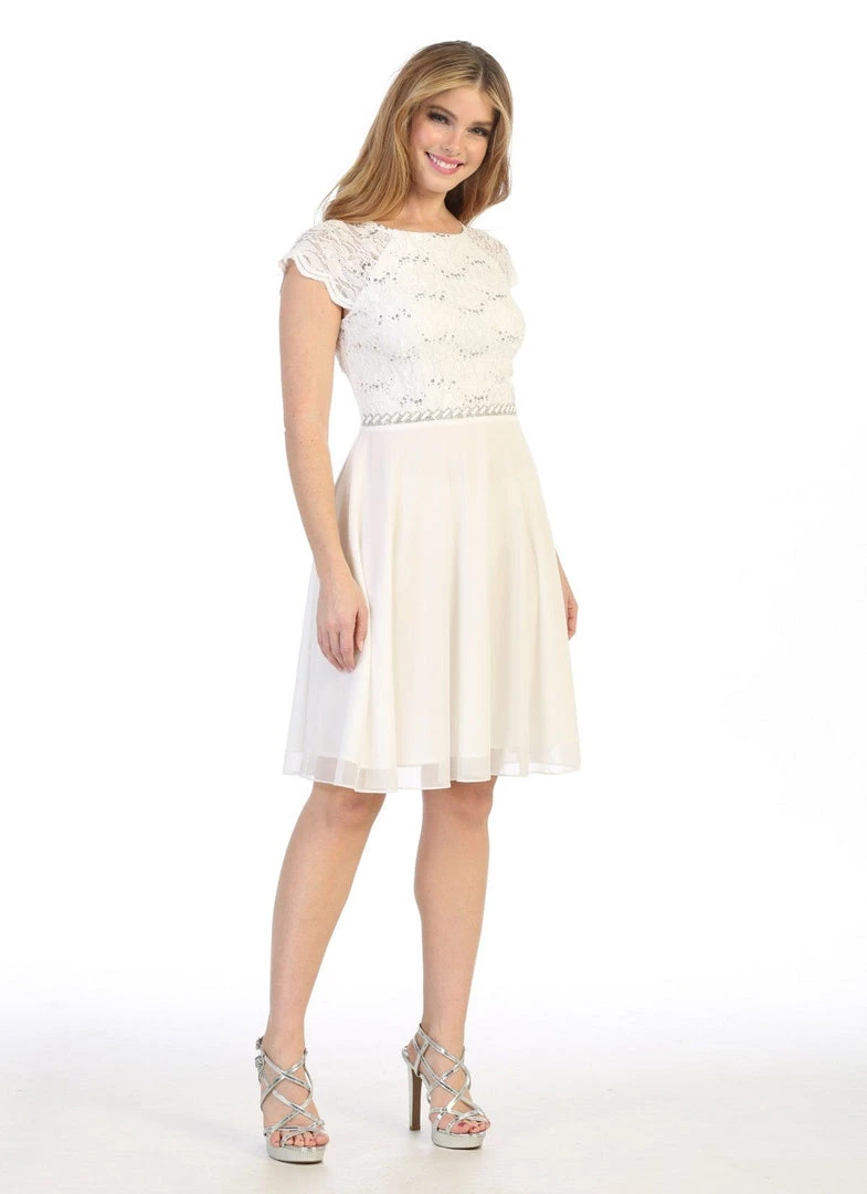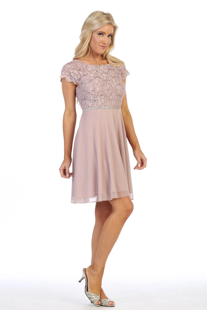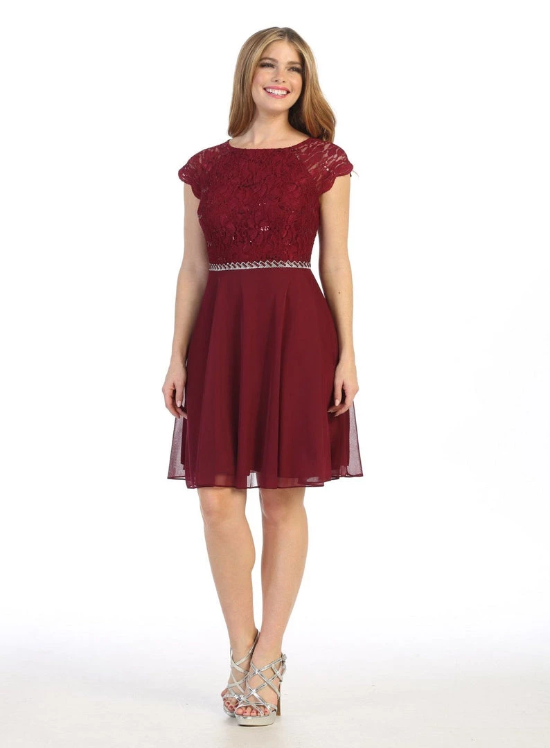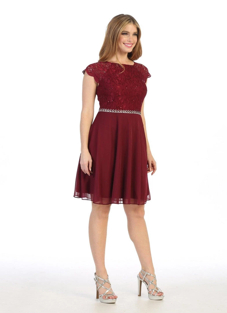 Look timeless in this lace top cocktail dress with short-sleeved bodice by Celavie 6394S. This beautiful knee length dress features a lace bodice with a high round neckline, short cap sleeves, a sparkly waistband adorned with rhinestones, enclosed lace back, short A-line skirt that falls at the knees, and a zipper closure. Affordably priced below $120, this short party dress is perfect for any formal event and will keep you on budget!