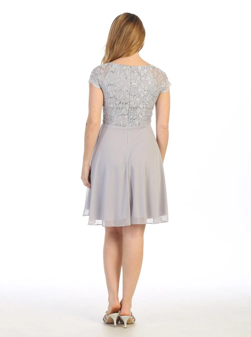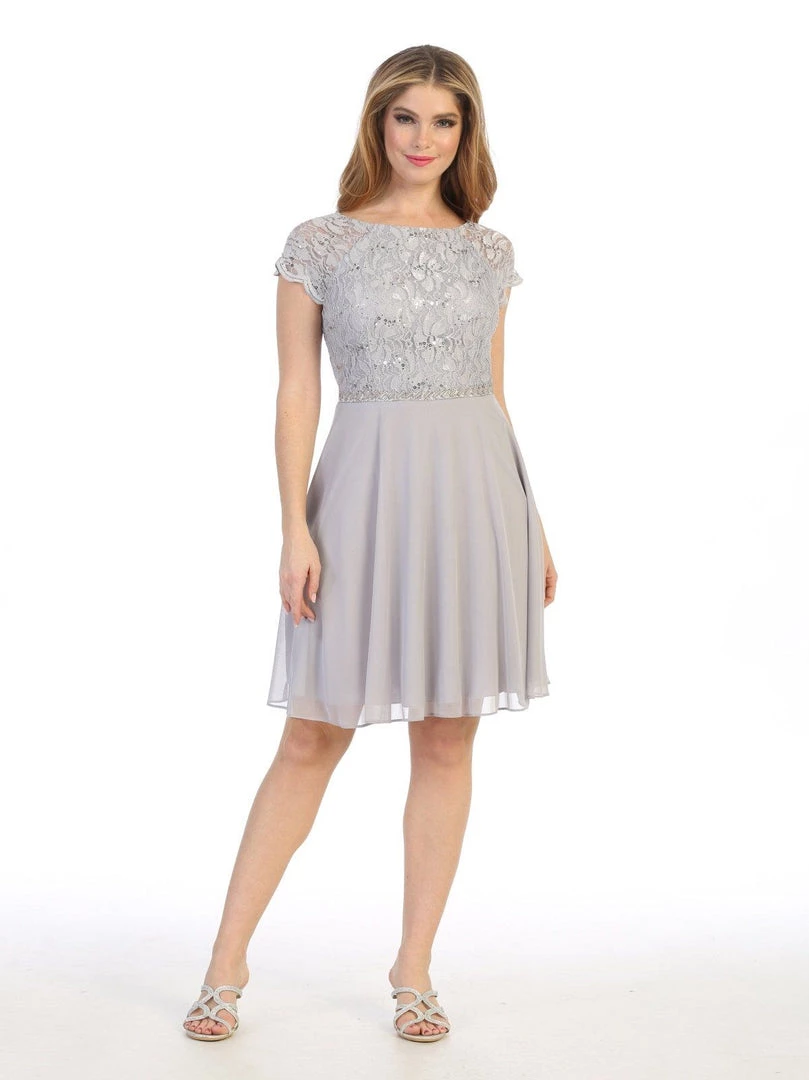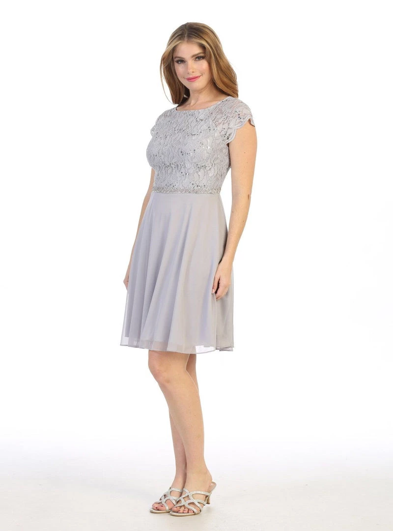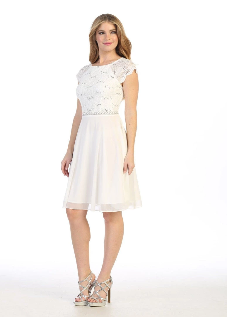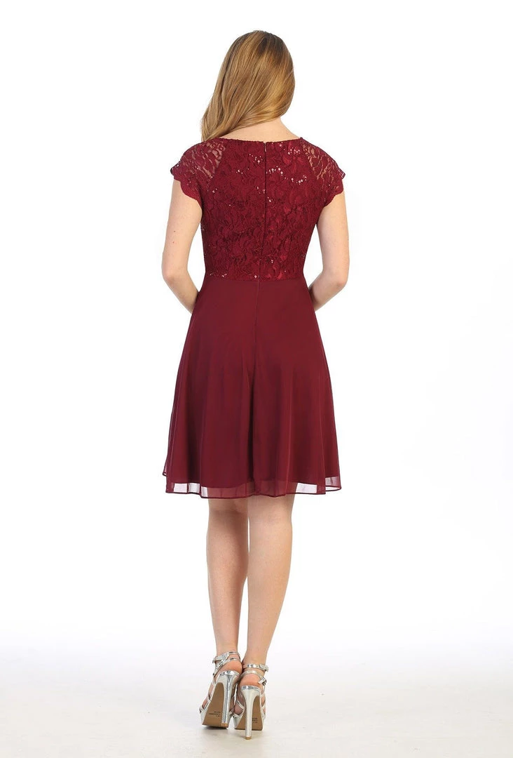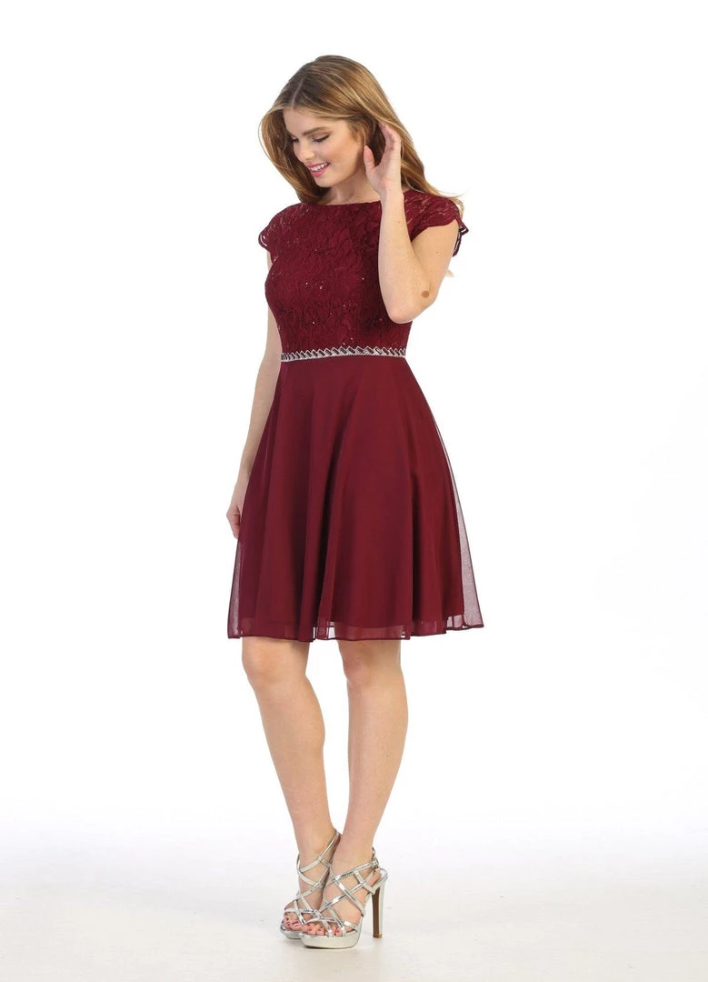 Look timeless in this lace top cocktail dress with short-sleeved bodice by Celavie 6394S. This beautiful knee length dress features a lace bodice with a high round neckline, short cap sleeves, a sparkly waistband adorned with rhinestones, enclosed lace back, short A-line skirt that falls at the knees, and a zipper closure. Affordably priced below $120, this short party dress is perfect for any formal event and will keep you on budget!