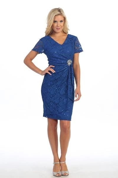 Look elegant in this knee length lace cocktail dress with short sleeves by Celavie 6038. Made out of sequined lace, this beautiful short dress features a short-sleeved bodice with a V-neckline, the gathered side is adorned with a sparkly brooch, open V-back, short fitted skirt that falls at the knees, and a zipper closure. Affordably priced at $120, this short party dress is perfect for any formal event and will keep you on budget!