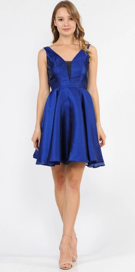 Be selfie-ready in this short V-neck metallic dress with side pockets by Poly USA 9018. Beautiful shiny sleeveless short dress with deep V-neckline, sheer inset panel, side pockets, open V-back, and a zipper closure. Affordably priced at $125, this short dress is perfect for any semi-formal event and will keep you on budget!